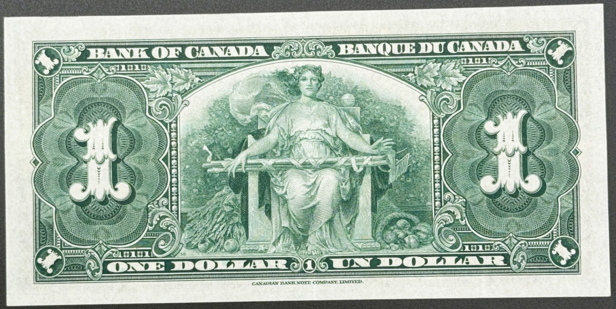 Fragment d’histoire issu de la première série modernisée de la Banque du Canada, ce 1 dollar 1937 – Préfixe U/L, signé Gordon/Towers et classé AU, constitue un artéfact matériel significatif du fiduciaire canadien de l’entre‑deux‑guerres. Le droit présente le portrait du roi George VI, gravé avec la sobriété caractéristique de l’époque, tandis que le revers offre une scène allégorique de l’agriculture, mettant en scène une figure féminine assise, accompagnée d’une corne d’abondance et de gerbes de blé, le tout inscrit dans un cadre décoratif élaboré. Le préfixe U/L, émis dans la phase tardive de la série, confère à ce billet une rareté structurelle accrue. Dans ce grade About Uncirculated, le billet conserve une fraîcheur du papier remarquable, des couleurs vives, et une intégrité nette des détails, permettant une lecture précise des éléments stylistiques et techniques. Une survivance d’un intérêt patrimonial notable, témoin de la première grande modernisation visuelle de la Banque du Canada.