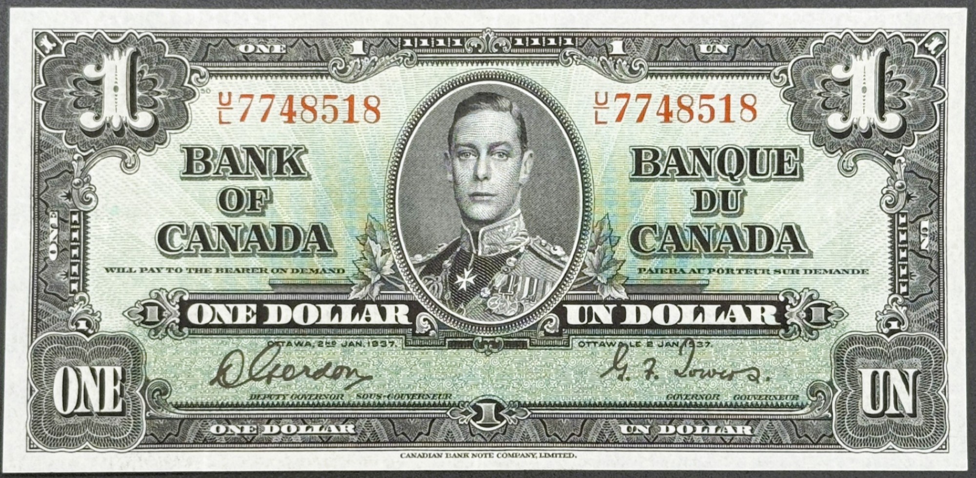 Banque du Canada – 1 Dollar 1937 – Gordon/Towers – Préfixe U/L – AU – BC-21c