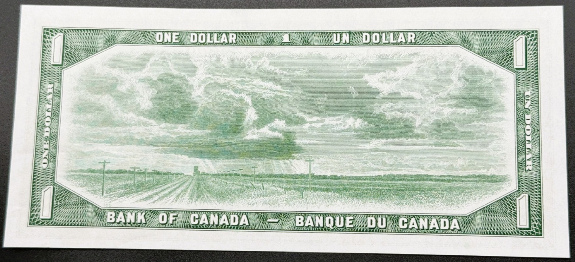 Cet exemplaire du billet de 1 dollar canadien de 1954, portant les signatures de Beattie et Rasminski, le préfixe Z/N et classé AU, appartient à la série dite du « Portrait de la Reine », première émission canadienne à présenter Élisabeth II après son accession au trône. Le recto offre une composition modernisée aux teintes vertes caractéristiques, tandis qu’au verso figure un paysage des Prairies, symbole d’ouverture et de vastes territoires, dans un style gravé propre aux productions de l’époque. Malgré une légère manipulation propre au grade AU, l’exemplaire conserve une fraîcheur remarquable et la finesse de cette émission emblématique