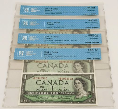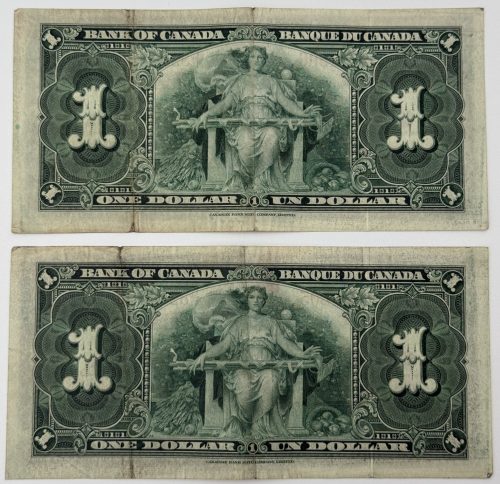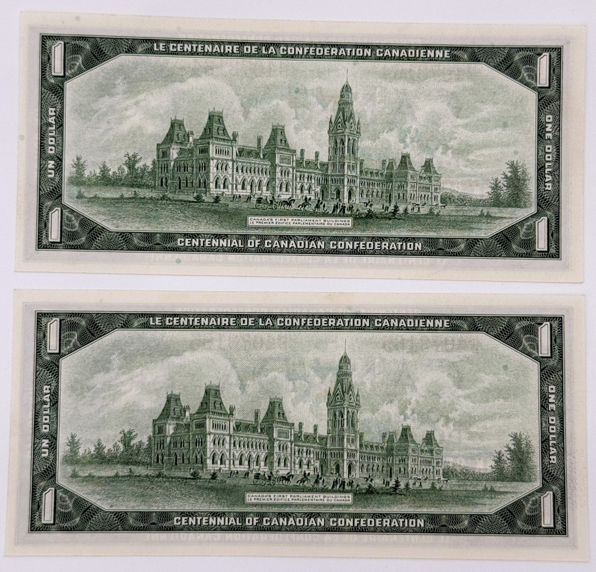 Émis pour commémorer le centenaire de la Confédération canadienne, ce billet de 1 Dollar 1967 présente au recto le portrait de la reine Elizabeth II, symbole de continuité monarchique, et au verso une vue du tout premier édifice du Parlement à Ottawa, détruit par l’incendie de 1916, remplaçant l’image des Prairies de la série 1954 afin de souligner la mémoire institutionnelle du pays. Portant les signatures de Beattie et Rasminski et le préfixe H/P, ces deux exemplaires se distinguent par leur cohérence historique et leur état Uncirculated (UNC), avec papier intact, couleurs éclatantes et détails parfaitement nets. Leur attrait est renforcé par le fait qu’ils forment une séquence de 2 billets consécutifs, ajoutant une continuité appréciée par les collectionneurs. Véritable ensemble patrimonial, ce duo conjugue prestige, authenticité et rareté, séduisant autant par la qualité de conservation que par la singularité de leurs numéros alignés.