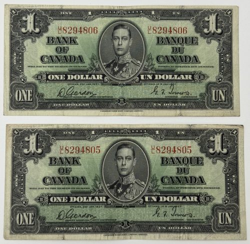 Banque du Canada – 1 Dollar 1967 – 2 Consécutifs – Beattie/Rasminski – Préfixe H/P – UNC