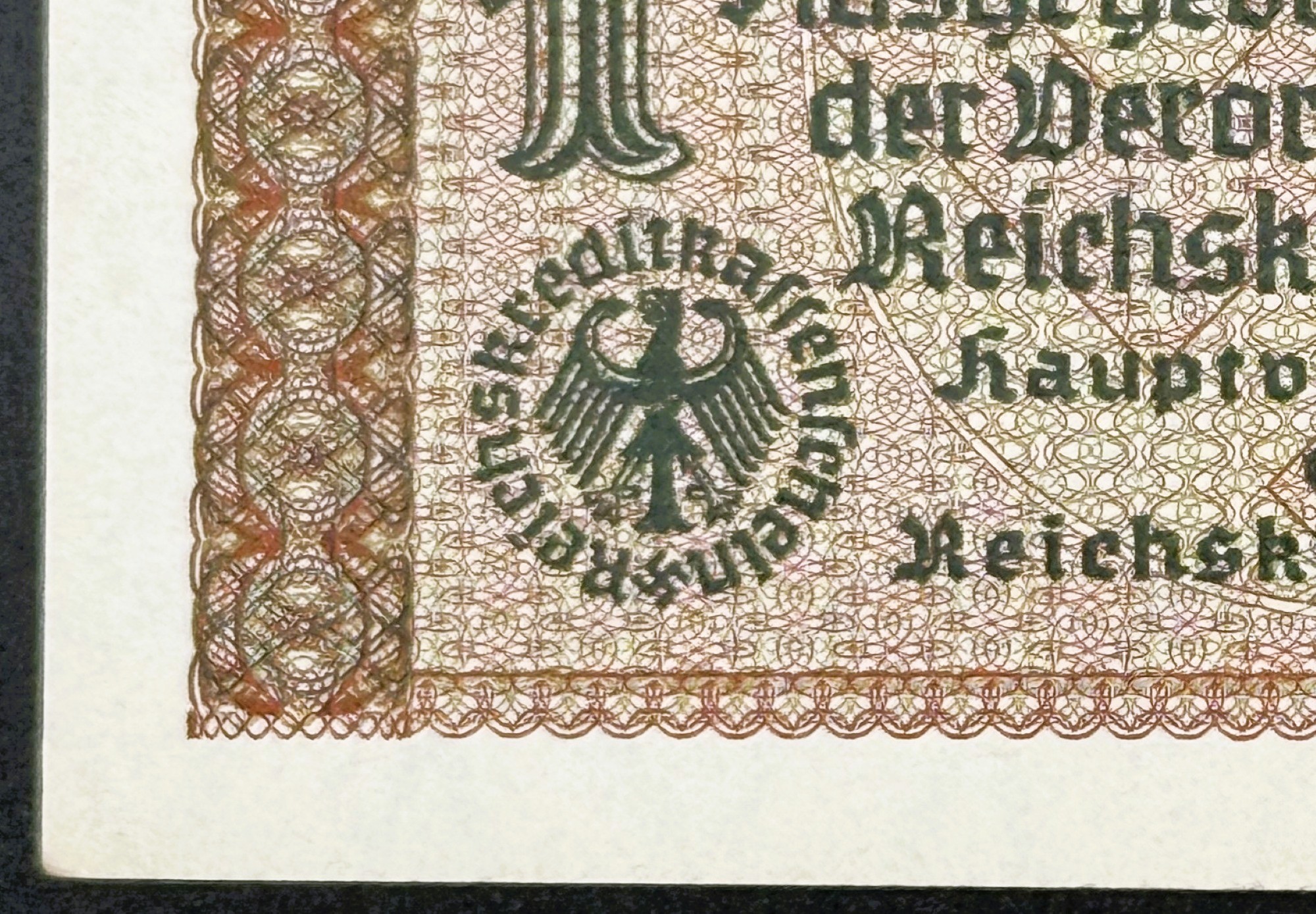 Présenté ici dans ses moindres détails : recto, verso et composition typographique, ce billet de 1 Reichsmark, émis par la Reichskreditkassen vers 1942, incarne une pièce de monnaie militaire utilisée dans les territoires occupés durant la Seconde Guerre mondiale. Le recto arbore une composition gothique soignée, avec numéro de série imprimé en rouge, encadrement géométrique, et l’emblème du régime (aigle et svastika) au centre du filigrane. Le verso, en brun symétrique, affiche la mention « Geldfälschung wird mit Zuchthaus bestraft » (La contrefaçon est punie de travaux forcés), soulignant la rigueur du système monétaire. Émis sous l’autorité de la Hauptverwaltung der Reichskreditkassen, ce billet relève d’une typologie militaire de substitution, distincte des émissions civiles, et fut utilisé dans des zones comme la France, la Belgique ou l’URSS. Conservé en état immaculé, sans pli ni altération, il se distingue par sa présentation complète, sa valeur documentaire, et son intérêt numismatique pour les chercheurs, conservateurs et collectionneurs soucieux de conjuguer esthétique, histoire et conscience. Ce lot est proposé dans une approche strictement patrimoniale, avec le souci de préserver la mémoire économique sans adhésion aux idéologies du régime en place.