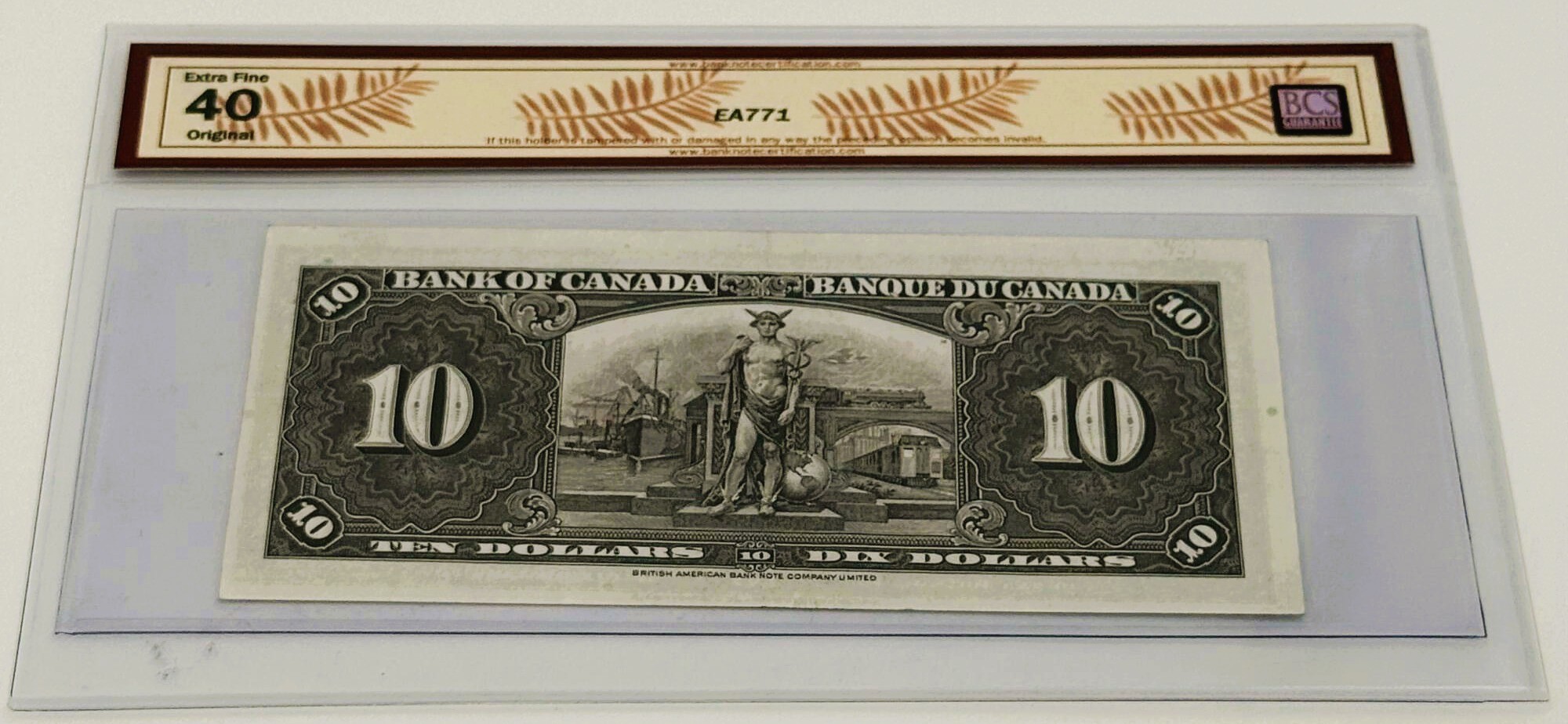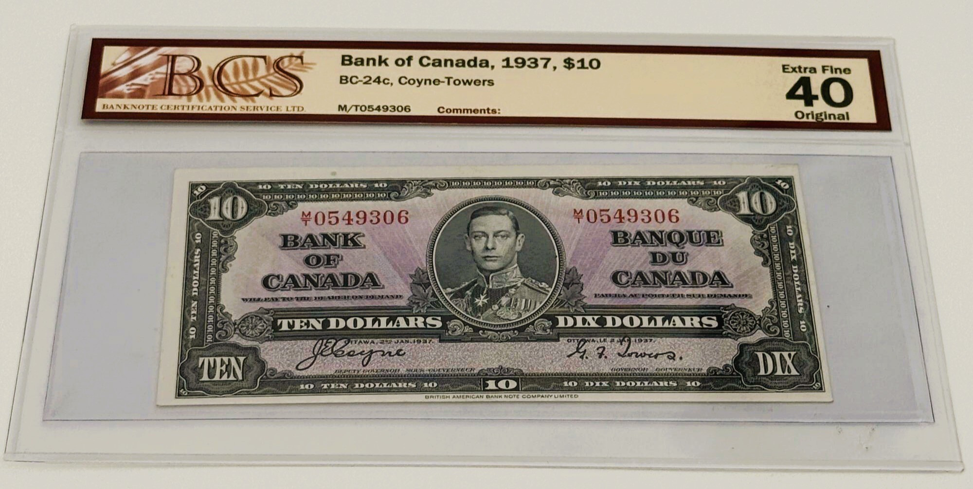 Banque du Canada – 10 Dollars 1937 – Coyne/Towers – Préfixe MT – Certifié EF40 – BC-24c