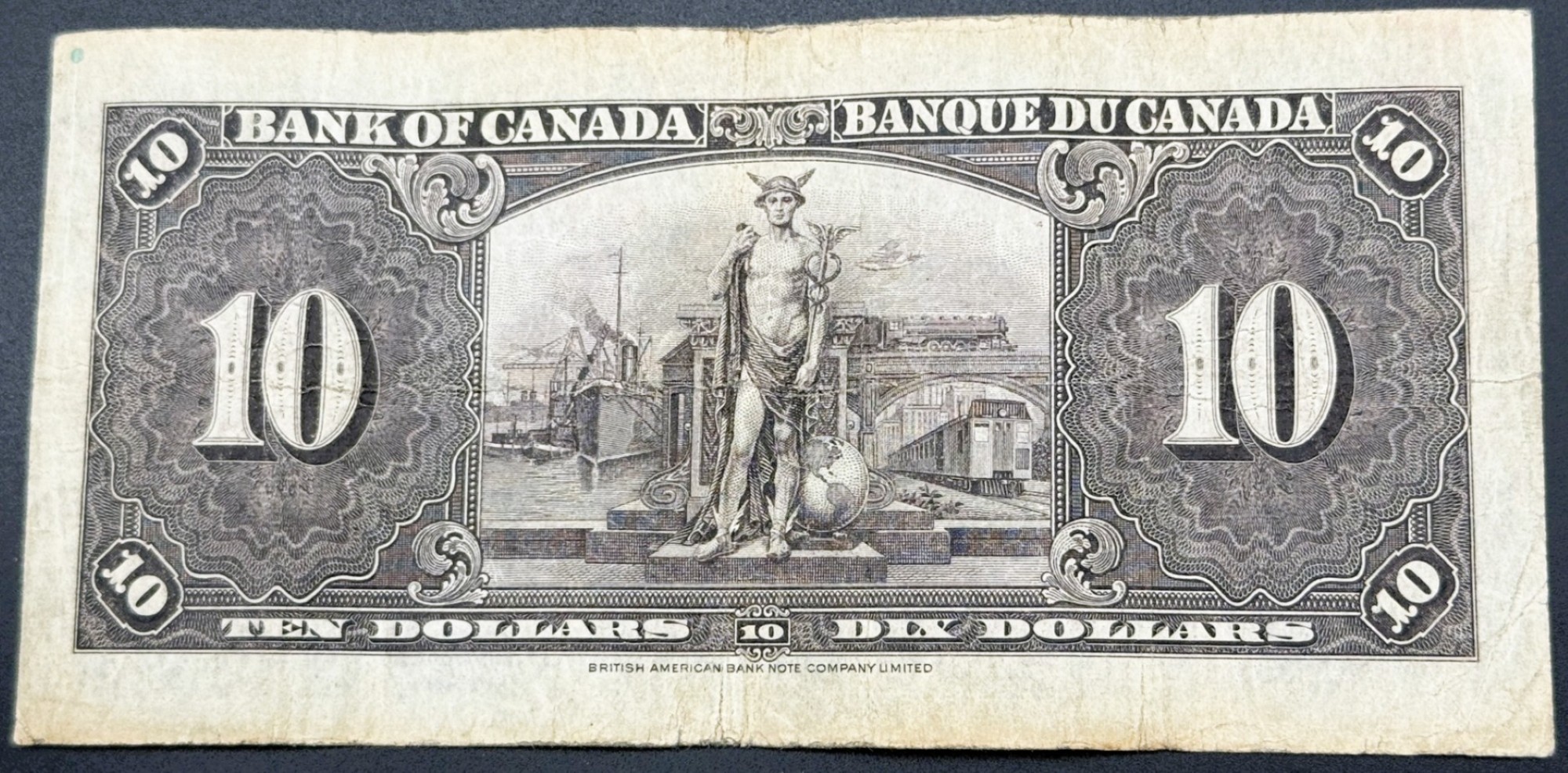 Cet exemplaire du billet de 10 dollars canadiens de 1937, portant les signatures de Gordon et Towers, le préfixe LD et classé VF, appartient à la première série entièrement conçue sous le règne de George VI. Le recto présente son effigie dans une composition classique aux teintes pourpres, tandis qu’au verso figure une allégorie du Commerce, montrant le dieu ailé Mercure, symbole des transports, debout devant un piédestal et un globe terrestre, entouré d’icônes représentant les moyens de transport modernes. Malgré l’usure modérée propre au grade VF, l’exemplaire conserve une bonne lisibilité et le caractère historique recherché de cette émission fondatrice.
