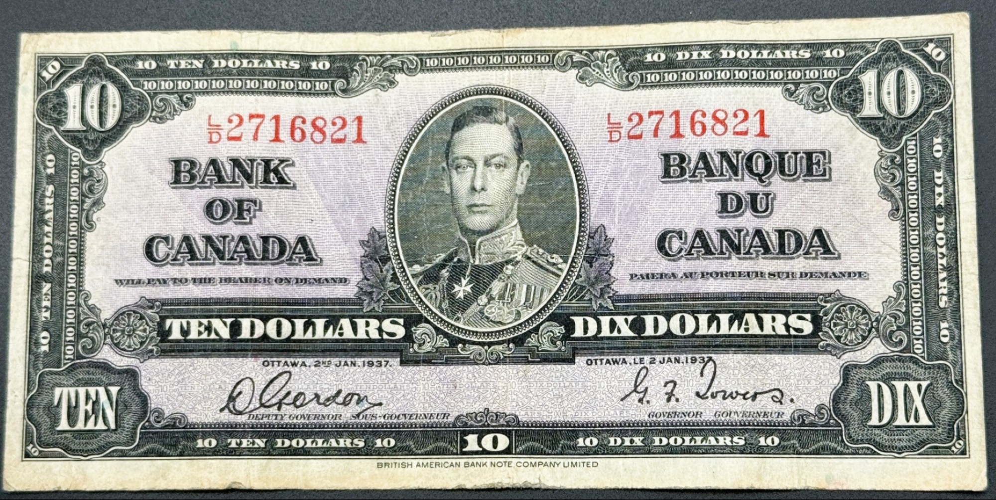 Banque du Canada – 10 Dollars 1937 – Gordon/Towers – Préfixe LD – VF