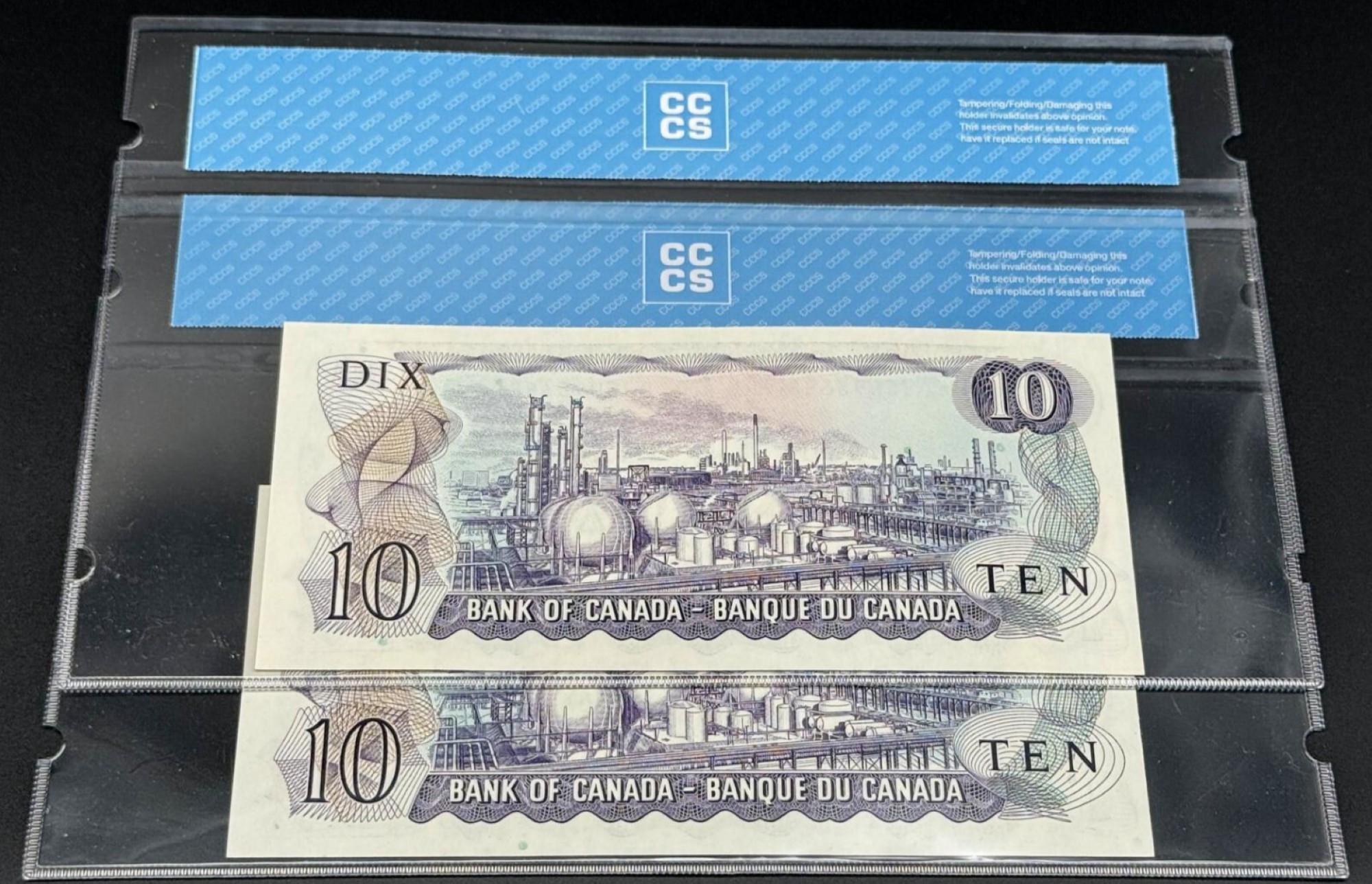 Émis dans le cadre de la série « Scènes du Canada », cet ensemble de deux billets de 10 dollars, portant les signatures de Beattie et Rasminski, le préfixe DJ et gradés GEM65, illustre une préservation remarquable pour cette génération. Le recto présente le portrait de Sir John A. Macdonald, tandis qu’au verso figure la gravure des installations de la Société Polymer Limitée, à Sarnia, en Ontario — une scène pétrochimique emblématique d’une industrie alors florissante, et dernière représentation industrielle jamais imprimée sur un billet canadien. La présence d’une paire de numéros consécutifs confère à l’ensemble une cohérence d’origine rare, magnifiée par un grade GEM65, où dominent la pureté du papier, l’équilibre des marges et la précision des détails imprimés.