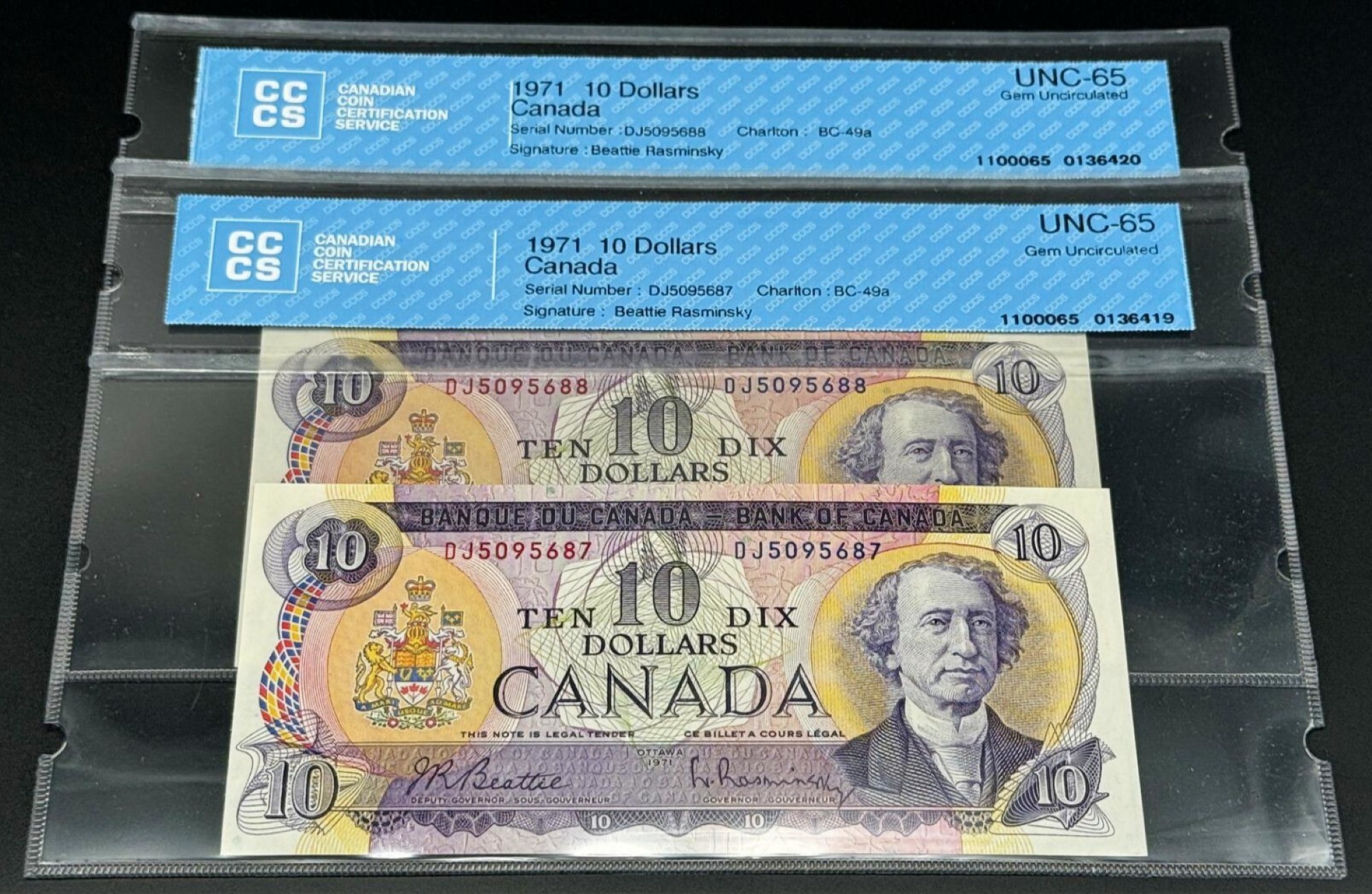Banque du Canada – 10 Dollars 1971 – 2 Consécutifs – Beattie/Rasminski – Préfixe DJ – GEM65 – BC-49a