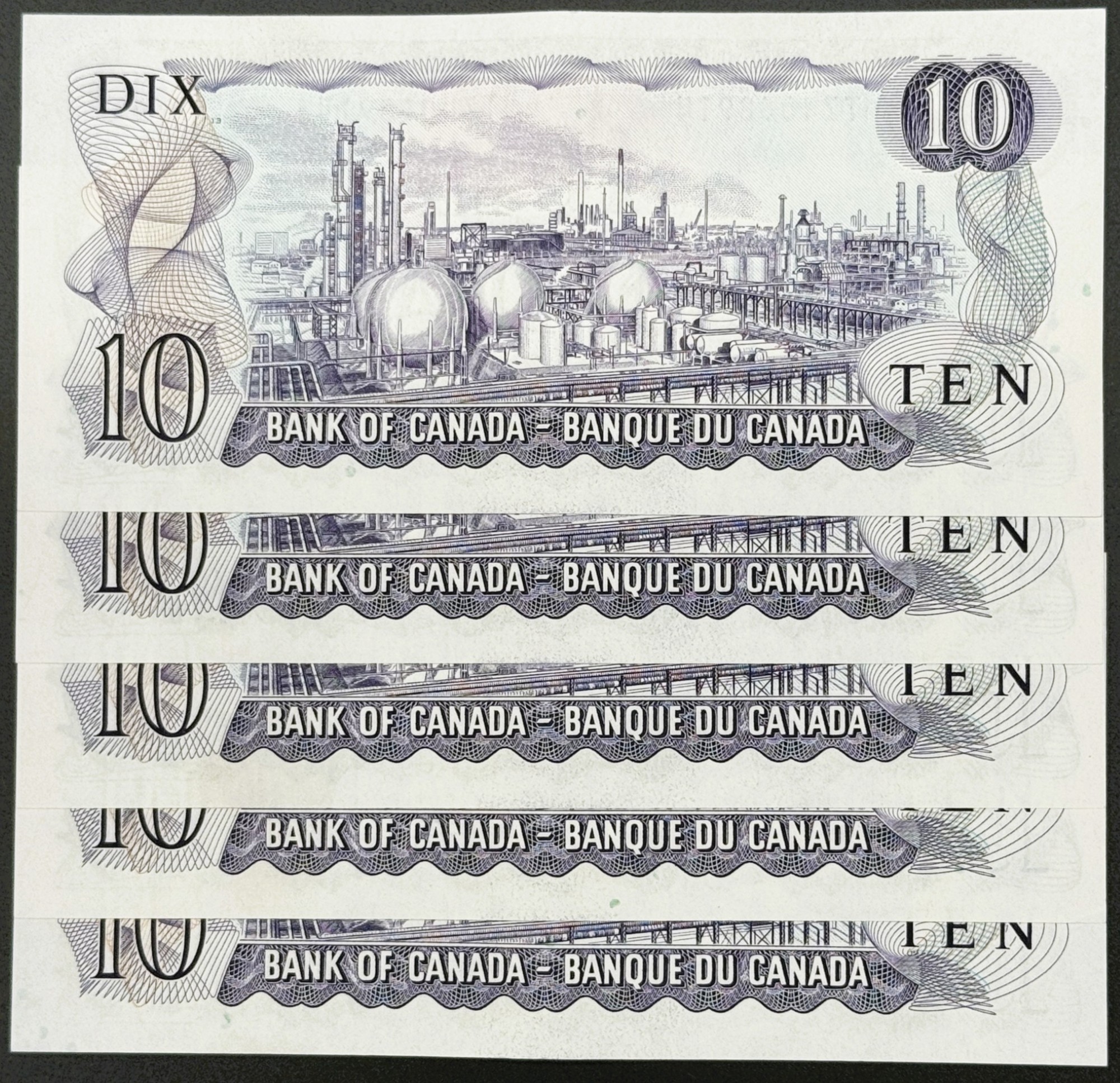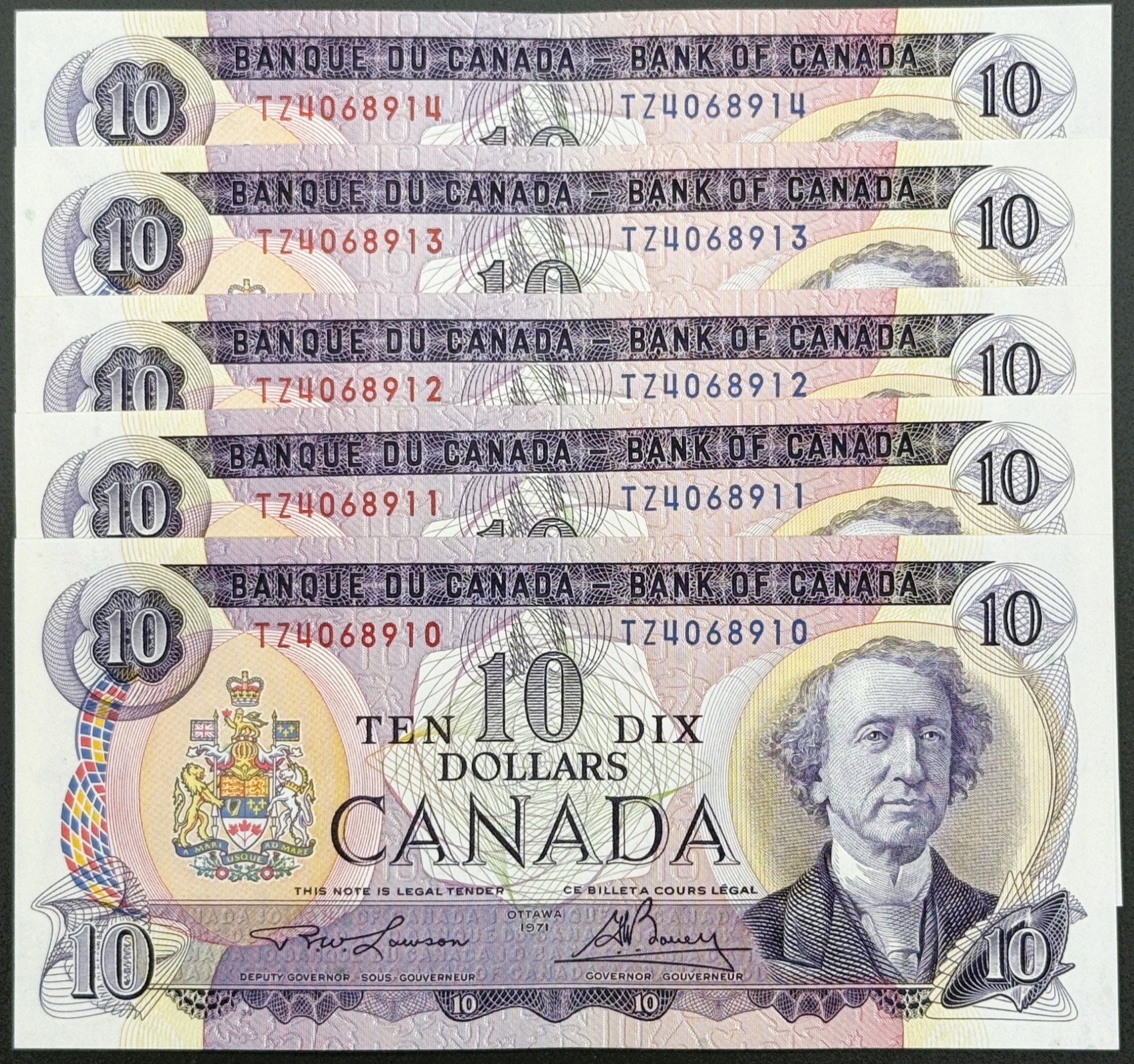 Banque du Canada – 10 Dollars 1971 – 5 Consécutifs – Lawson/Bouey – Préfixe TZ – AU