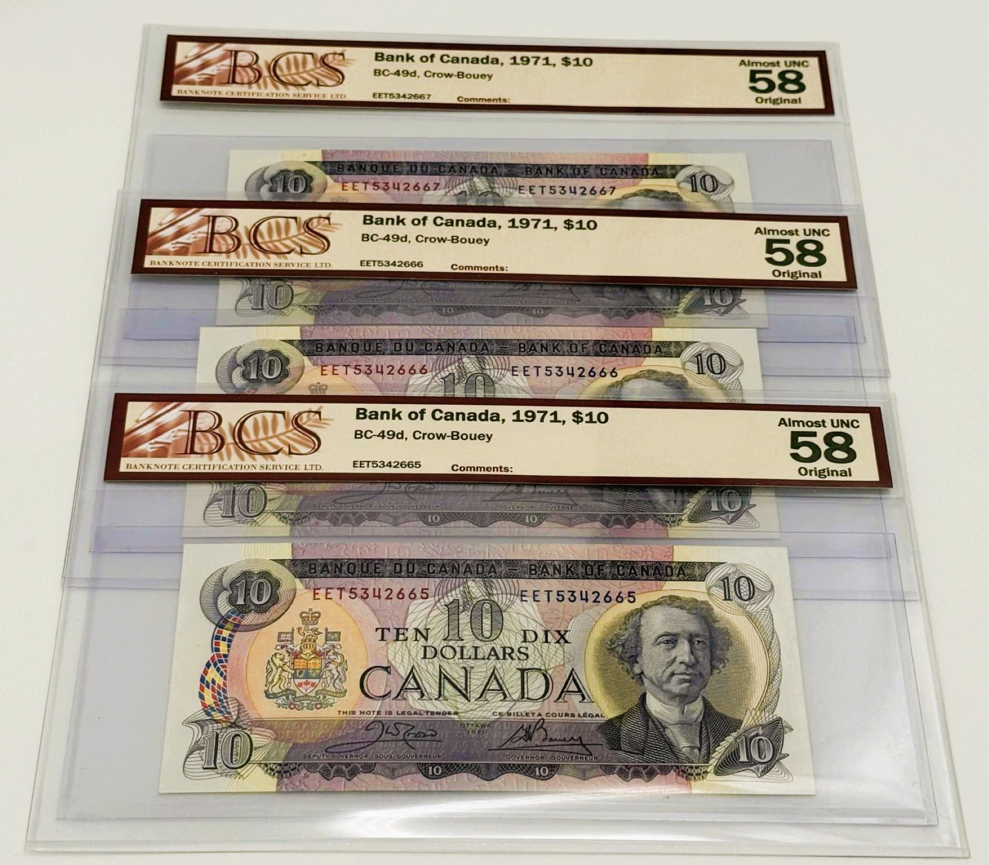Banque du Canada – 10 Dollars 1971 – 3 Consécutifs – Crow/Bouey – Préfixe EET – AU58 – BC-49d