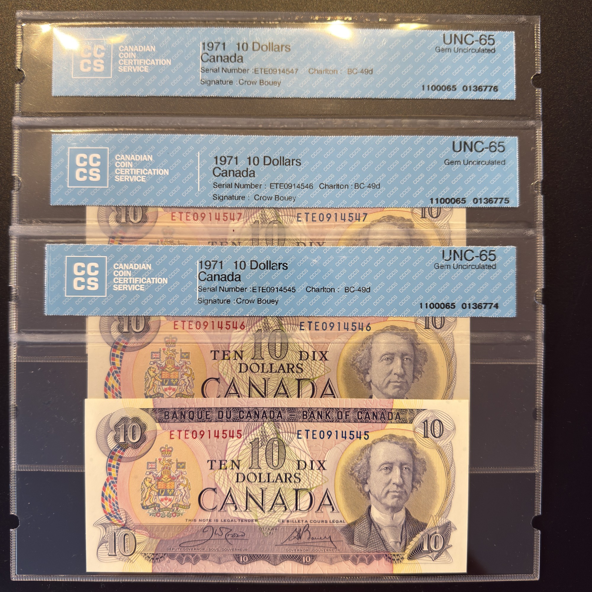 Banque du Canada – 10 Dollars 1971 – 3 Consécutifs – Crow/Bouey – Préfixe ETE – GEM65 – BC-49d