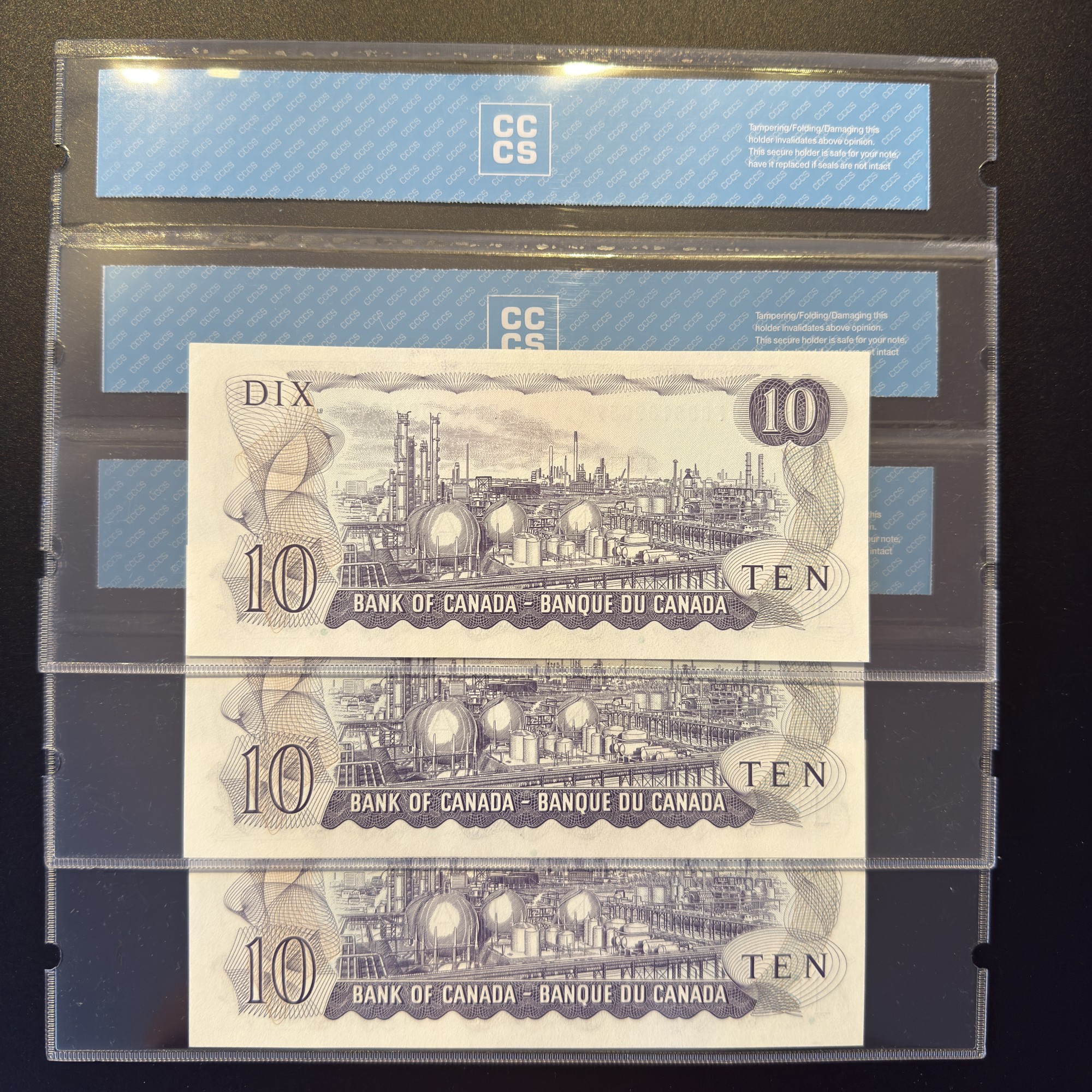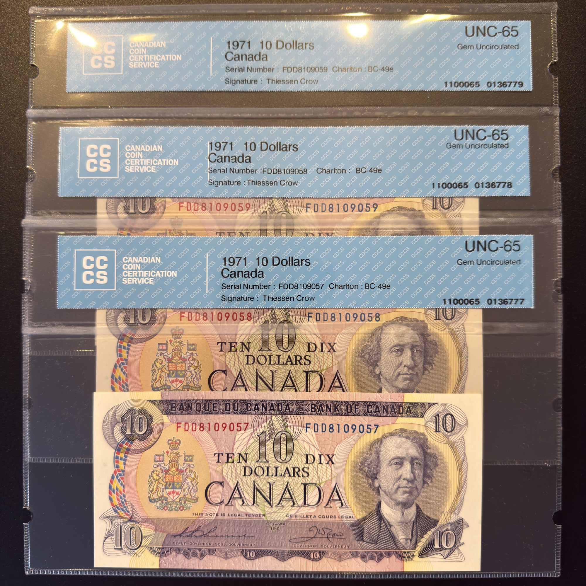 Banque du Canada – 10 Dollars 1971 – 3 Consécutifs – Thiessen/Crow – Préfixe FDD – GEM65 – BC-49e