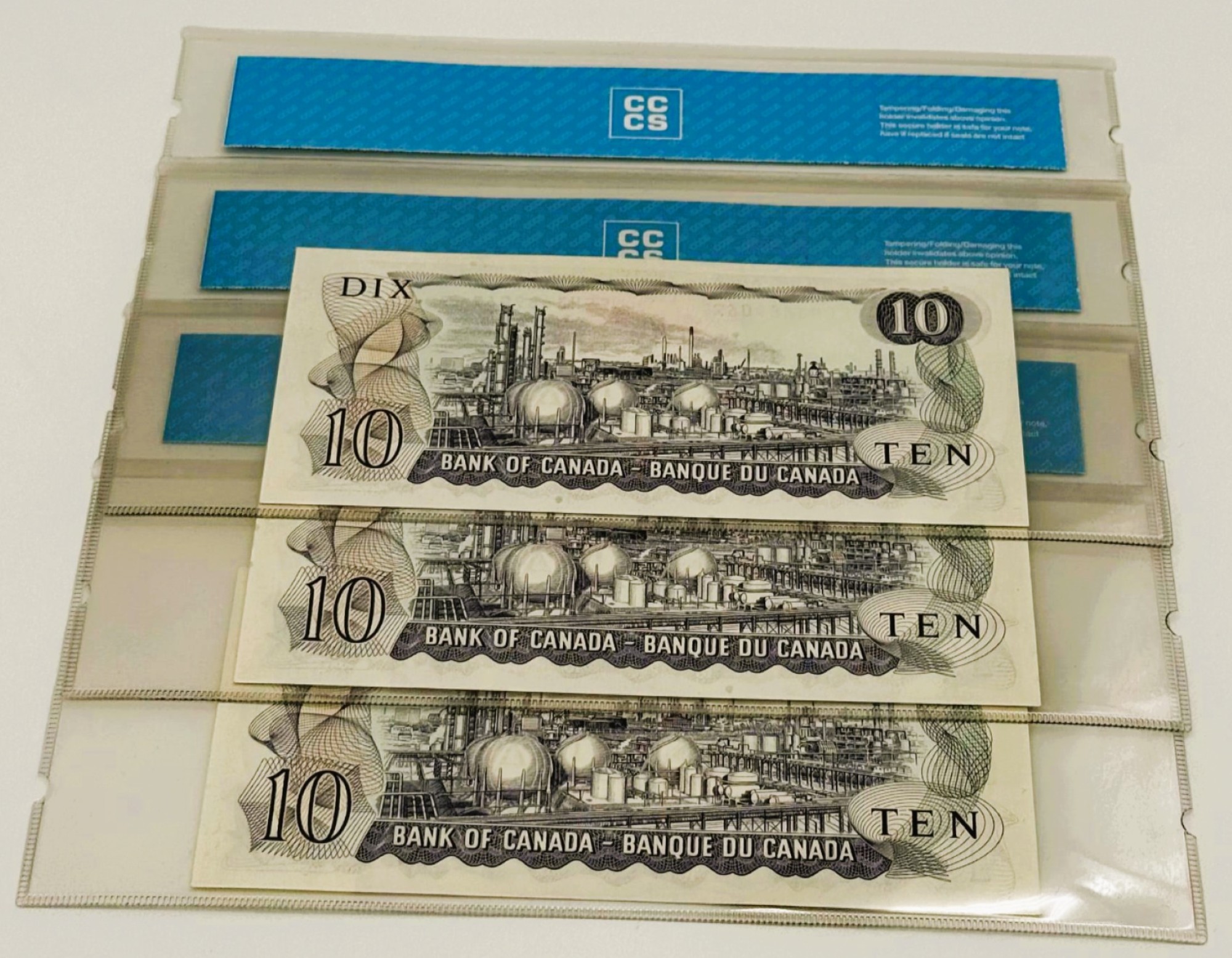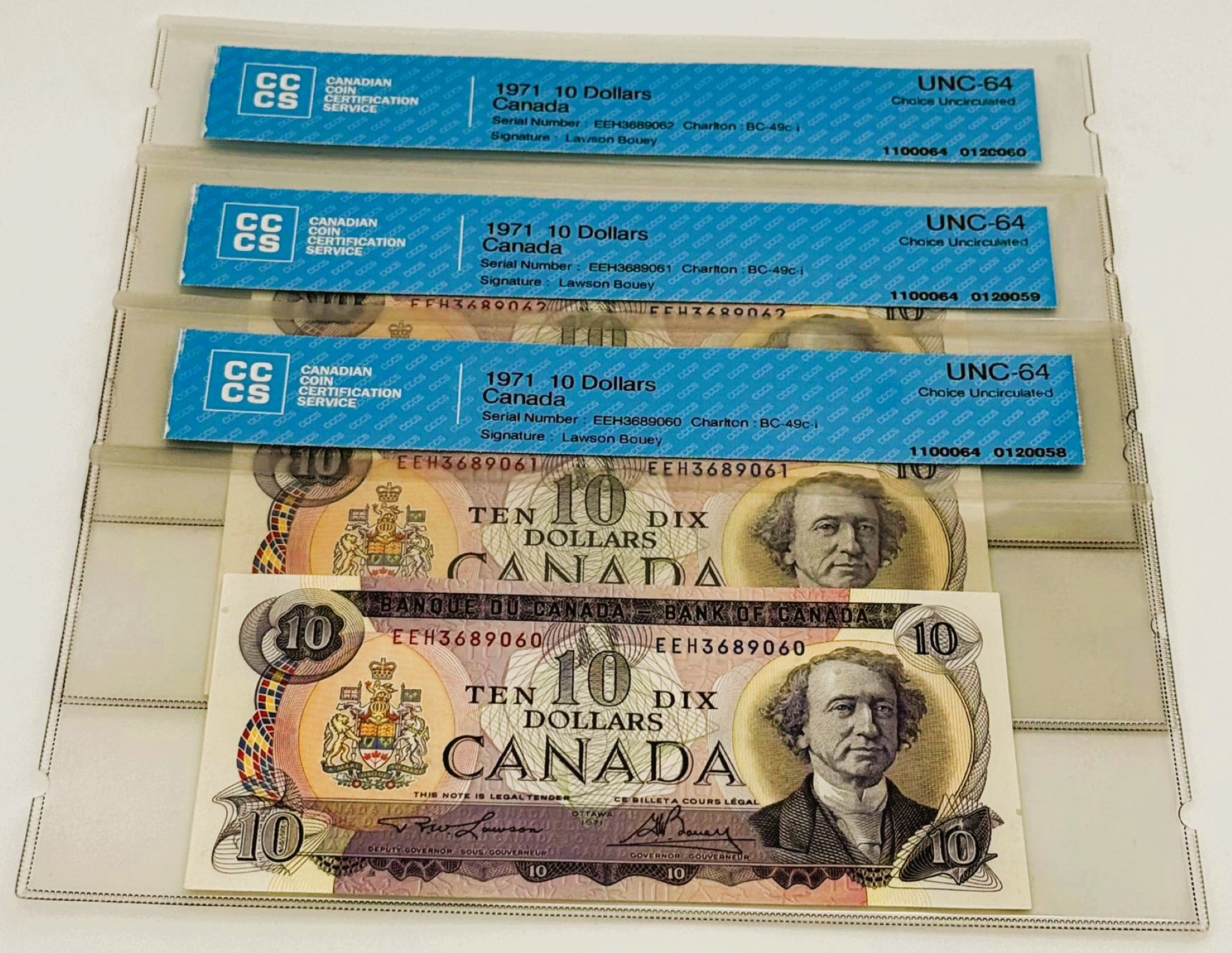Banque du Canada – 10 Dollars 1971 – 3 Consécutifs – Lawson/Bouey – Préfixe EEH – UNC64 – BC-49c-i