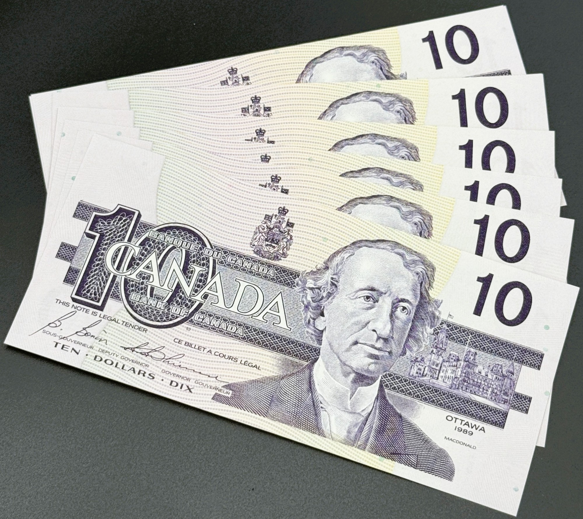 Banque du Canada – 10 Dollars 1989 – 10 Consécutifs – Bonin/Thiessen – Préfixe BDV – UNC