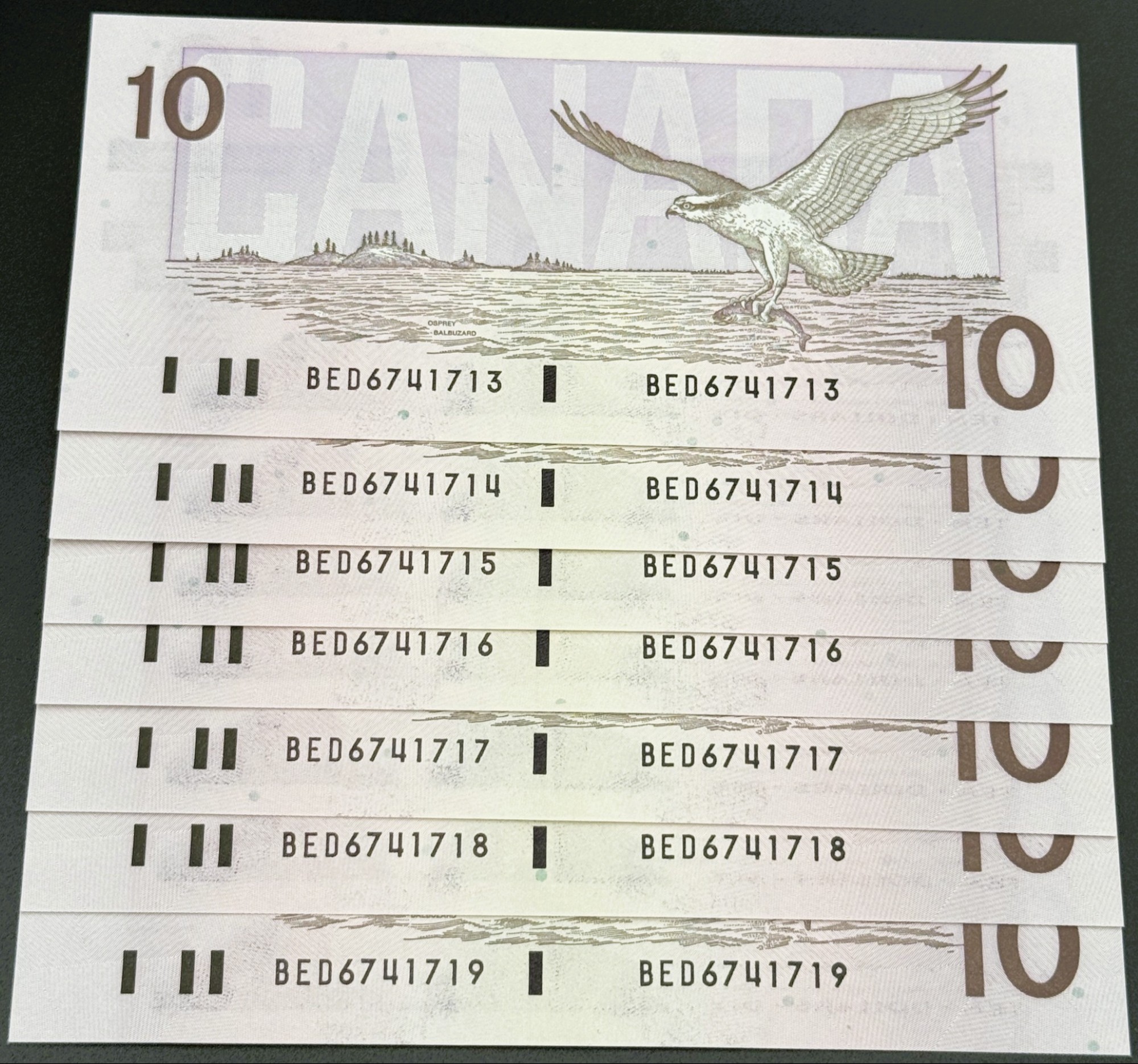 Banque du Canada – 10 Dollars 1989 – 7 Consécutifs – Bonin/Thiessen – Préfixe BED – UNC