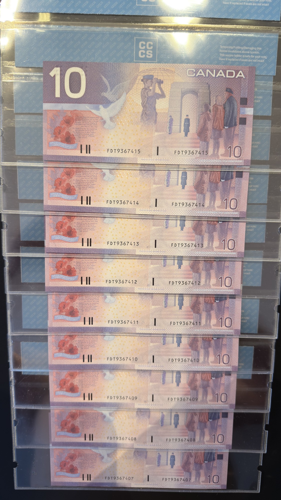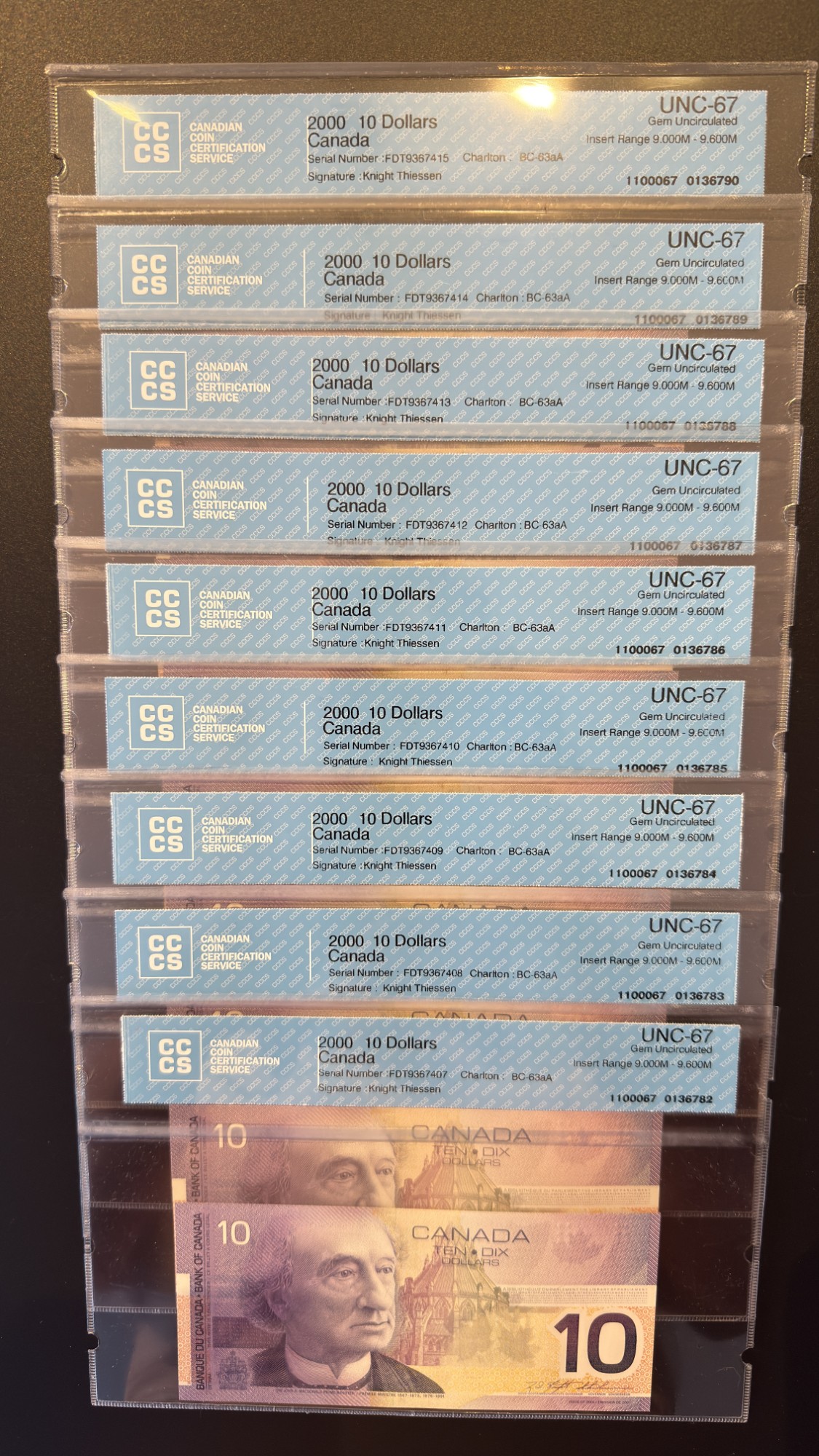 Banque du Canada – 10 Dollars 2000 – Billets de Remplacement (Insert Range) – 9 Consécutifs – Knight / Thiessen – Préfixe FDT – GEM67 – BC-63aA