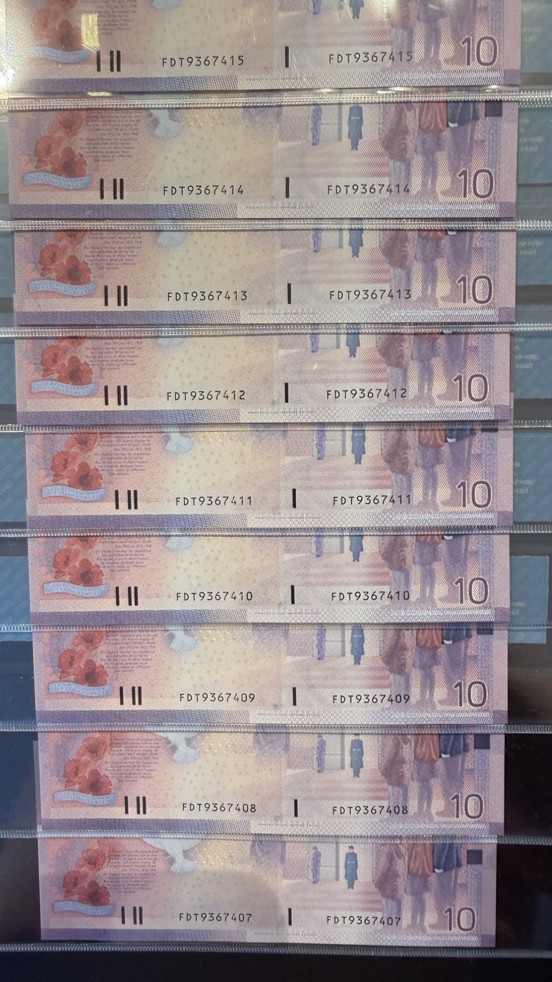 Ensemble exceptionnel composé de neuf billets consécutifs de 10 dollars 2000, portant le préfixe FDT et signés Knight / Thiessen, tous issus de l’insert range 9.000M – 9.600M, une plage de numéros réservée aux billets de remplacement dans la série Canadian Journey. Cette caractéristique technique, propre aux émissions modernes, confère à l’ensemble une rareté structurelle marquée, d’autant plus remarquable qu’il s’agit ici d’un bloc complet de huit numéros consécutifs, une survivance rarissime pour des remplacements destinés à être insérés individuellement dans les liasses de production. On y retrouve le portrait de Sir John A. Macdonald, accompagné au revers de la composition commémorative dédiée au souvenir et au sacrifice, illustrée par les coquelicots, la colombe et les silhouettes militaires devant le monument. Ces billets atteignent un niveau de qualité exceptionnel, offrant un papier immaculé, une impression d’une netteté remarquable et des marges d’une précision quasi parfaite. Un ensemble d’une cohérence, d’une pureté et d’un prestige rares, idéal pour couronner une collection avancée de remplacements modernes ou pour enrichir une section thématique consacrée aux émissions commémoratives du tournant du millénaire.