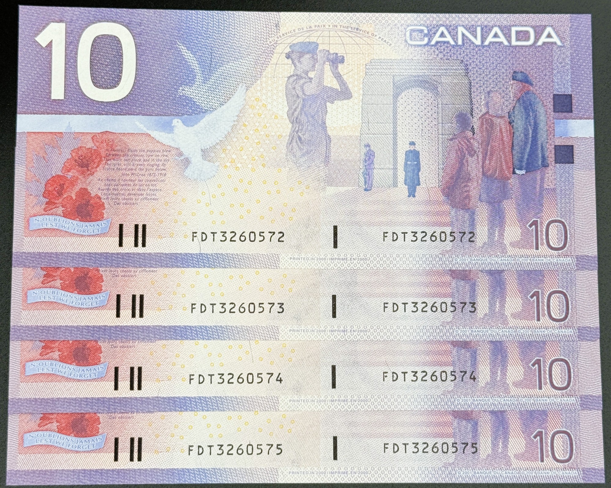 Émis en 2001 par la Banque du Canada, cette séquence de quatre billets consécutifs de 10 Dollars, signés Knight et Thiessen et portant le préfixe FDT, inaugure la série Canadian Journey. Le recto rend hommage à Sir John A. Macdonald, premier Premier ministre du Canada et figure fondatrice de la Confédération. Le verso déploie une composition commémorative vibrante : colombe blanche, coquelicots, clairon militaire, arche du souvenir et enfants observateurs, accompagnés d’un extrait du poème In Flanders Fields. La continuité des quatre numéros consécutifs confère homogénéité et rareté à ce lot court, témoin de la transition vers une nouvelle génération de billets.