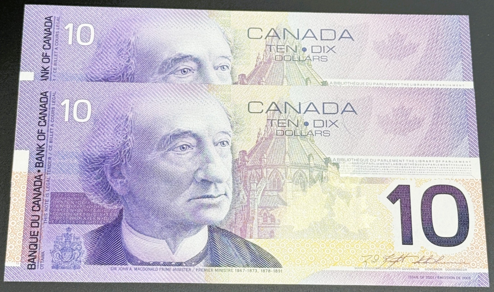 Banque du Canada – 10 Dollars 2001 – 2 Consécutifs – Knight/Thiessen – Préfixe FDT – UNC