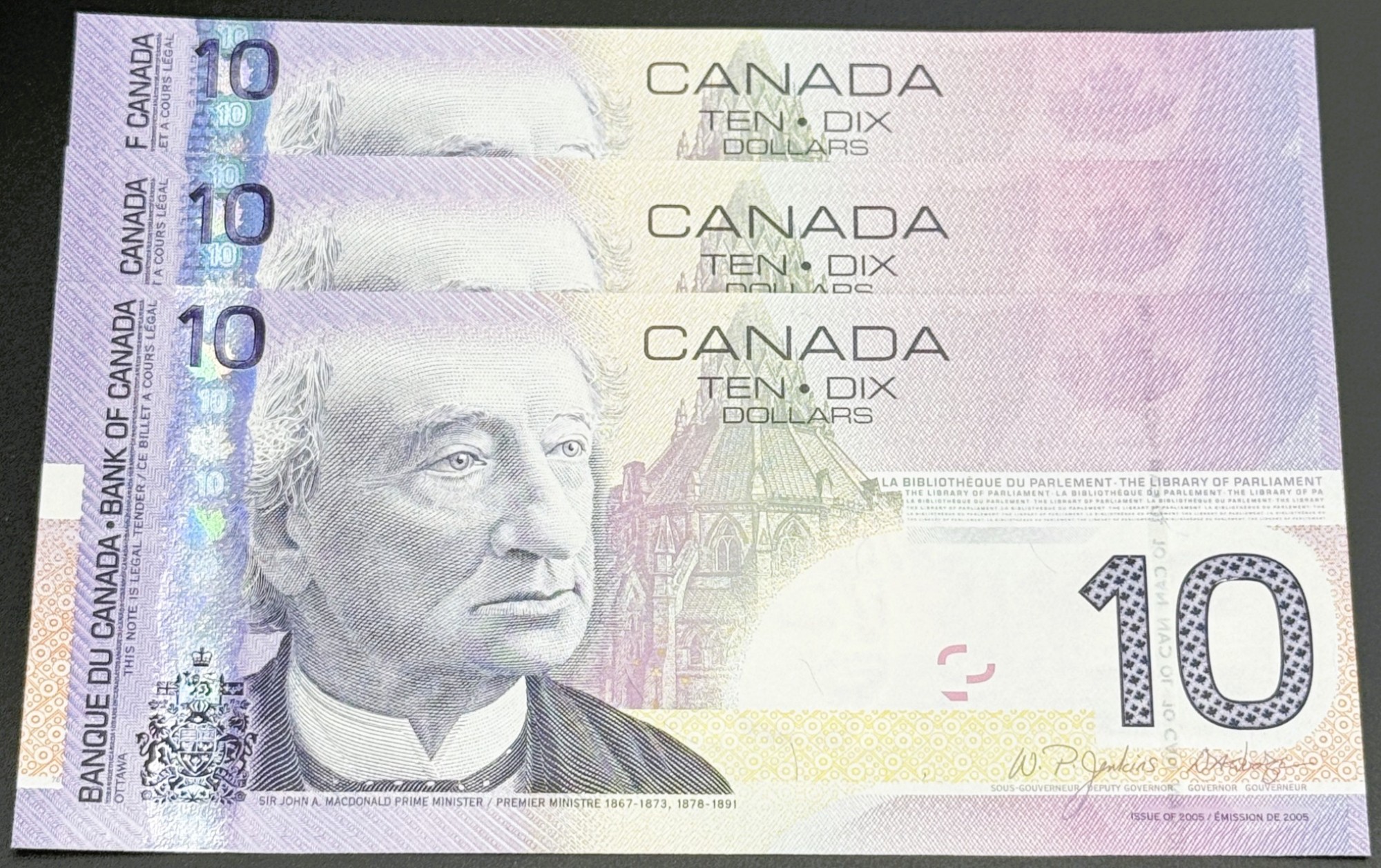 Banque du Canada – 10 Dollars 2005 – 3 Consécutifs – Jenkins/Dodge – Préfixe BTJ – UNC