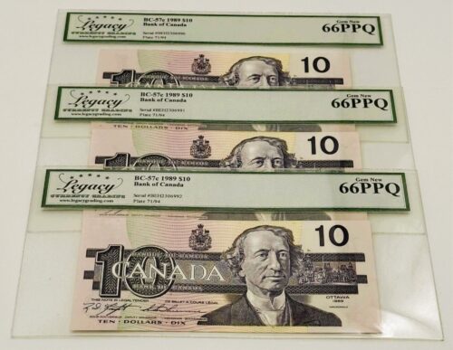 Émis en 2005 par la Banque du Canada, cette séquence de vingt‑cinq billets consécutifs de 10 Dollars, signés Jenkins et Dodge et portant le préfixe BTK, conserve les visuels emblématiques de la série Canadian Journey tout en intégrant la bande holographique de sécurité, évolution majeure par rapport à l’émission de 2001. Le recto rend hommage à Sir John A. Macdonald, premier Premier ministre du Canada et figure fondatrice de la Confédération. Le verso déploie une composition commémorative vibrante : colombe blanche, coquelicots, clairon militaire, arche du souvenir et enfants observateurs, accompagnés d’un extrait du poème In Flanders Fields. La continuité parfaite de vingt‑cinq numéros consécutifs magnifie l’homogénéité et la puissance symbolique de ce lot, qui se distingue par son prestige et sa valeur patrimoniale, digne des collections muséales les plus prestigieuses.