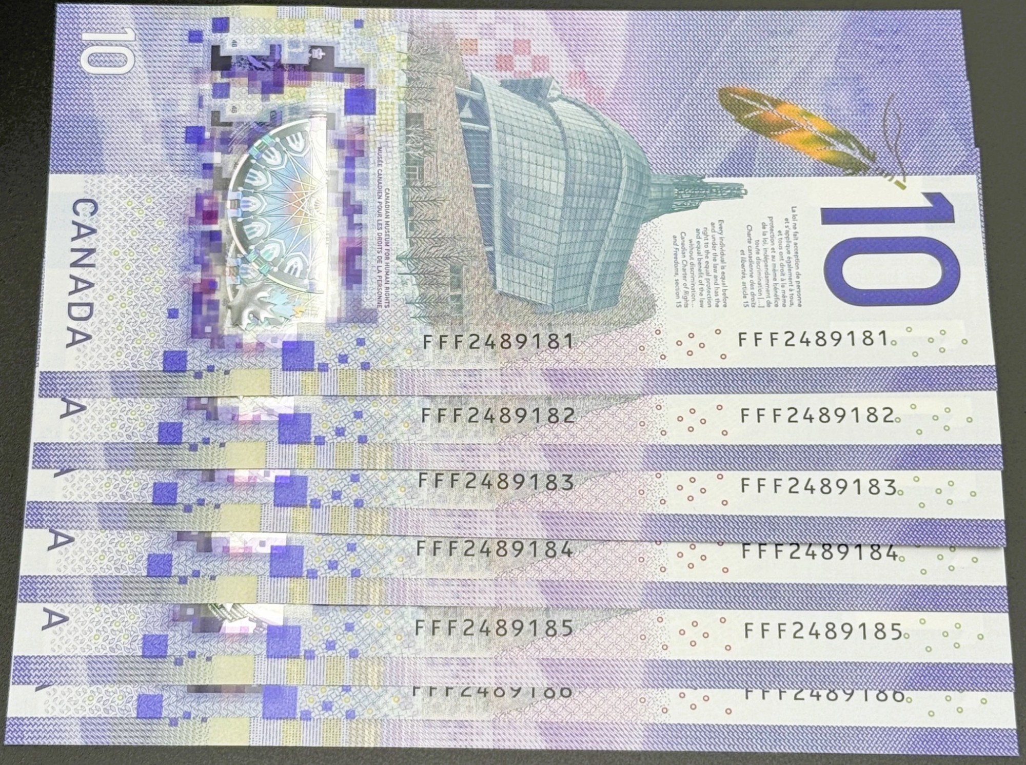 Émis en 2018 par la Banque du Canada, cette séquence de six billets consécutifs de 10 Dollars, signés Wilkins et Macklem et portant le préfixe FFF, illustre la nouvelle esthétique des billets verticaux en polymère. Le recto présente le portrait de Viola Desmond, pionnière des droits civiques et symbole de courage. Le verso met en valeur le Musée canadien pour les droits de la personne à Winnipeg, accompagné de dispositifs de sécurité avancés et fenêtres transparentes. La continuité des six numéros consécutifs confère homogénéité et rareté à ce lot intermédiaire, témoin de l’évolution visuelle et sociale des billets canadiens.