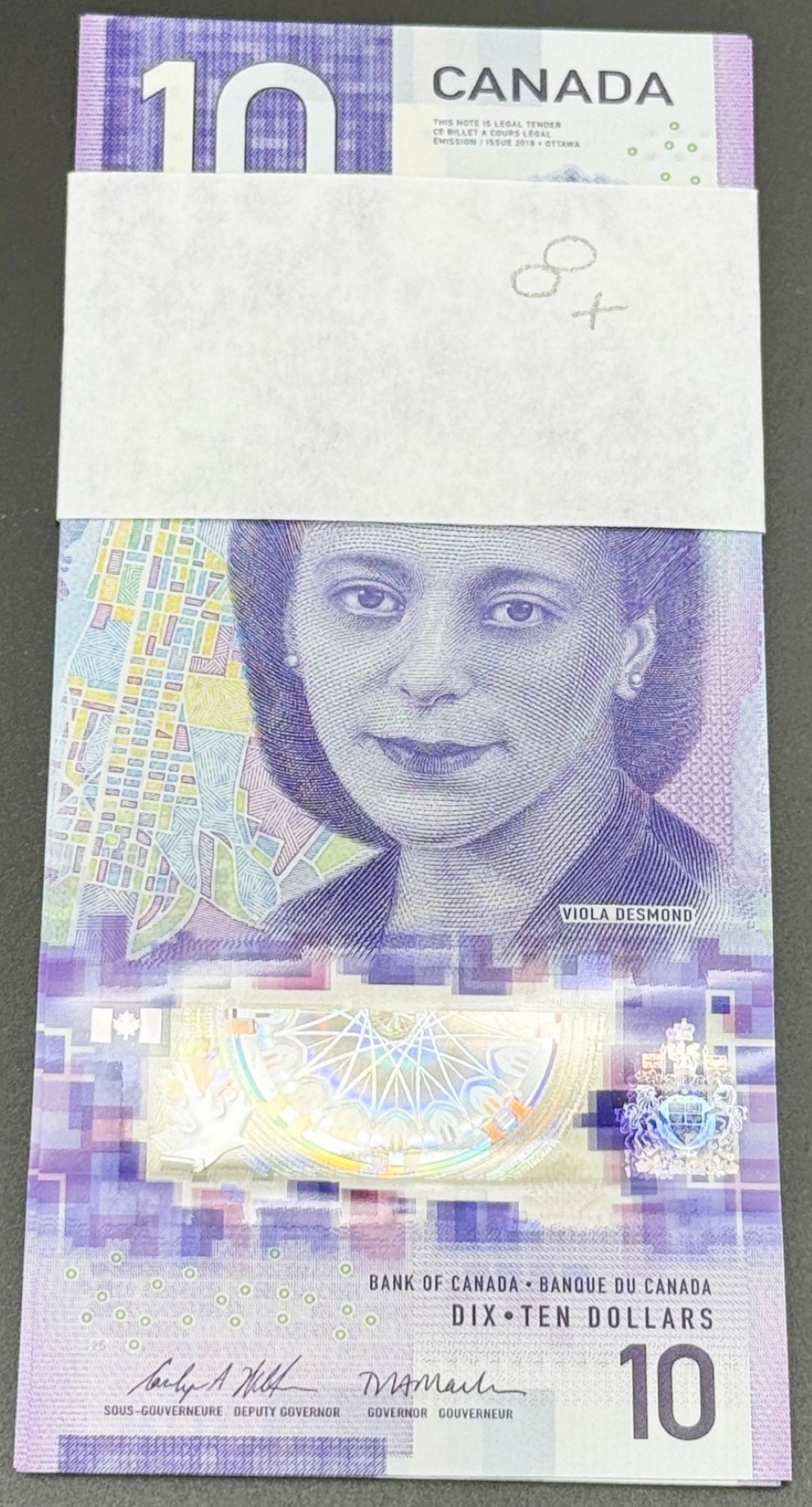 Émis en 2018 par la Banque du Canada, cette séquence de huit billets consécutifs de 10 Dollars, signés Wilkins et Macklem et portant le préfixe FFK, illustre la nouvelle esthétique des billets verticaux en polymère. Le recto présente le portrait de Viola Desmond, pionnière des droits civiques et symbole de courage. Le verso met en valeur le Musée canadien pour les droits de la personne à Winnipeg, accompagné de fenêtres transparentes et dispositifs de sécurité avancés. La continuité des huit numéros consécutifs confère homogénéité et rareté à ce lot intermédiaire supérieur, témoin de l’évolution visuelle et sociale des billets canadiens.