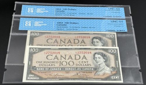 Émis dans la première série complète de la Banque du Canada, ce billet de 100 Dollars 1937 incarne la jeunesse institutionnelle de la banque centrale, fondée et opérationnelle dès 1935. Le recto présente le portrait du roi George VI, symbole de continuité monarchique et de stabilité à la veille de la Seconde Guerre mondiale, encadré par un décor ornemental riche et solennel. Le verso illustre une allégorie du Commerce, avec une figure féminine tenant un navire marchand et des symboles liés aux échanges, célébrant la vitalité économique et l’ouverture internationale du Canada. Portant les signatures de Gordon et Towers et le préfixe BJ, cet exemplaire est d’autant plus remarquable qu’il s’agit d’un changeover note, témoin de la transition entre les signatures Coyne/Towers et Gordon/Towers, ce qui en accroît la rareté et l’intérêt historique. Certifié VF25, il se situe dans un grade intermédiaire, offrant une conservation supérieure aux exemplaires plus usés, avec des détails encore bien présents et une lisibilité affirmée. Ce billet conjugue authenticité, rareté et prestige patrimonial, séduisant autant par son état préservé que par la singularité de son statut de changeover dans une série emblématique.