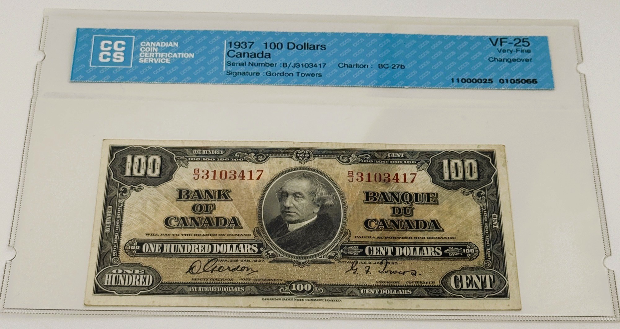Banque du Canada – 100 Dollars 1937 – Gordon/Towers – Préfixe BJ – Certifié VF25 – BC-27b – changeover