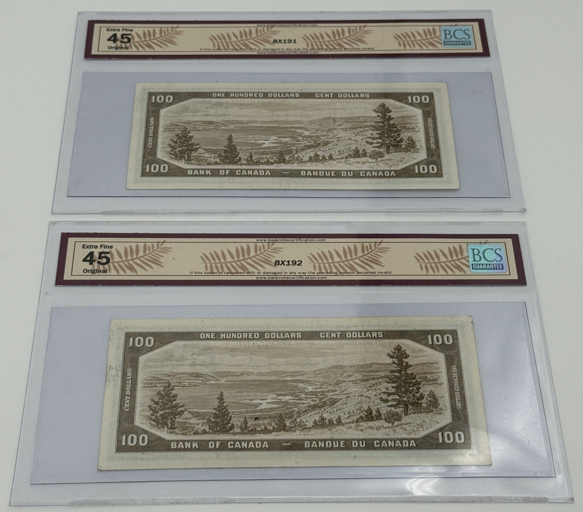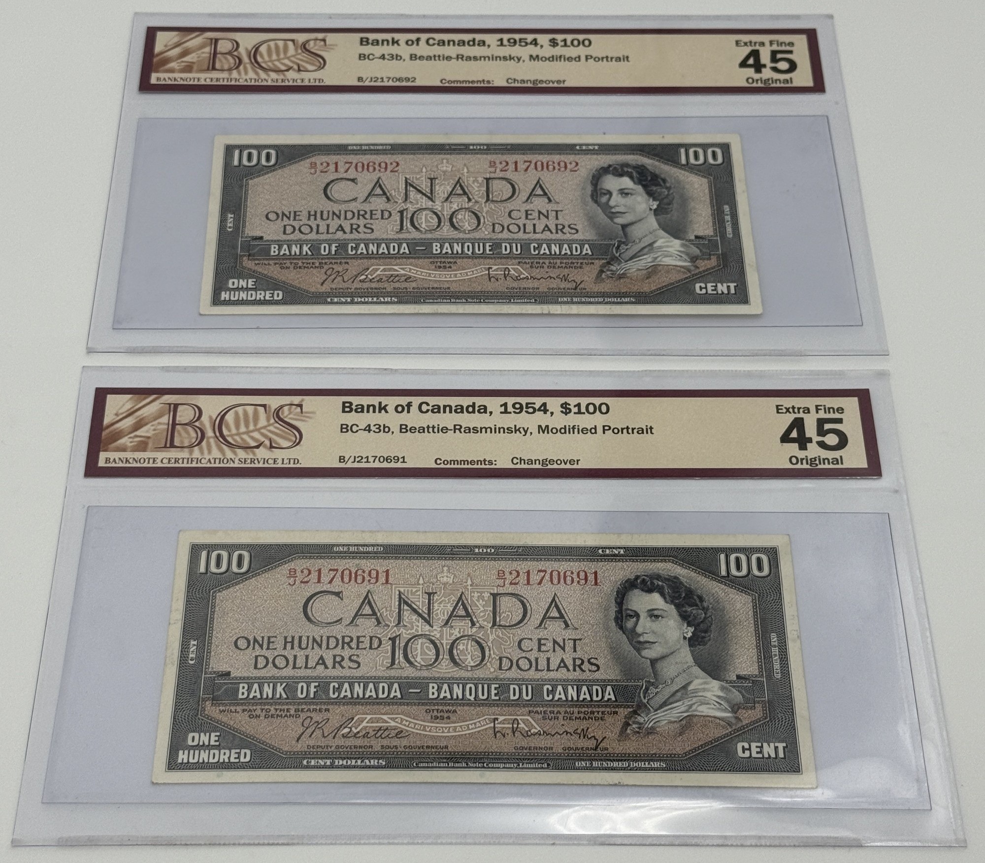 Banque du Canada – 100 Dollars 1954 – 2 consécutifs – Beattie/Rasminski – Préfixe BJ – EF45 – BC-43b – Changeover