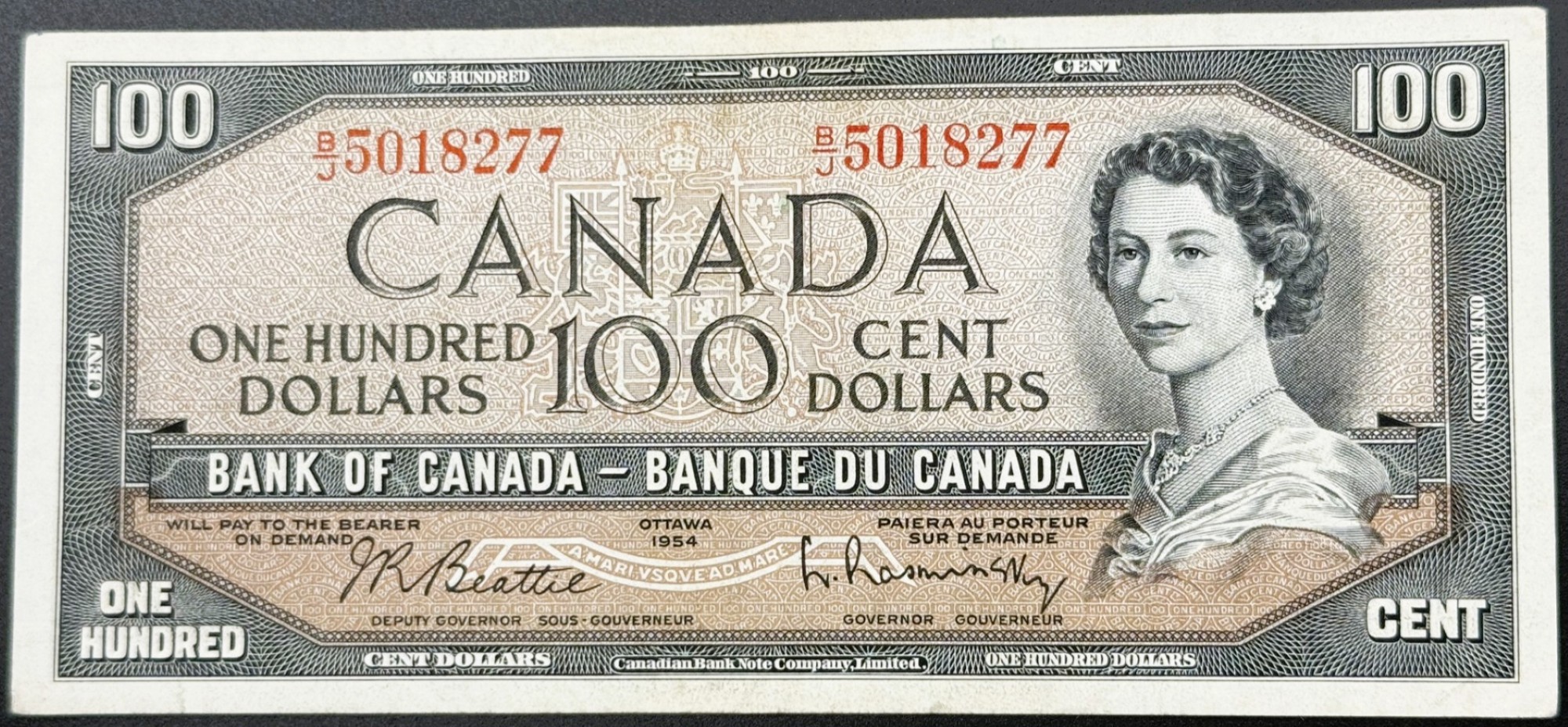 Banque du Canada – 100 Dollars 1954 – Beattie/Rasminski – Préfixe BJ – BC-43b