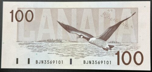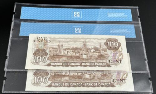 Cette paire consécutive de billets de 100 dollars émis en 1954 par la Banque du Canada incarne une rareté structurelle et visuelle d’envergure. Arborant le préfixe BJ et signés par Beattie et Rasminski, ces deux billets sont certifiés UNC63, témoignant d’une conservation supérieure : papier immaculé, encres nettes, centrage équilibré et structure irréprochable. Leur alignement séquentiel confère à cet ensemble une cohérence rare et une valeur accrue aux yeux des collectionneurs exigeants. Le recto présente le portrait de la Reine Elizabeth II dans sa version au visage modifié (Modified Portrait), encadré par une composition majestueuse aux tons brun foncé. Ce visuel, emblématique de la série de 1954, incarne la stabilité monarchique et la rigueur fiduciaire de l’époque, tout en affirmant la solennité de la plus haute dénomination courante. Au verso, une scène panoramique du fleuve Saskatchewan est représentée avec une finesse gravée remarquable. Ce paysage naturel, vaste et paisible, évoque la grandeur géographique du Canada et renforce le caractère patrimonial du billet. Pièces jumelées dans une séquence rare et continue, ces deux billets de 100 dollars consécutifs gradés UNC63 incarnent la puissance fiduciaire, la rareté structurelle et l’élégance institutionnelle, un duo prestigieux au sommet des émissions classiques canadiennes.