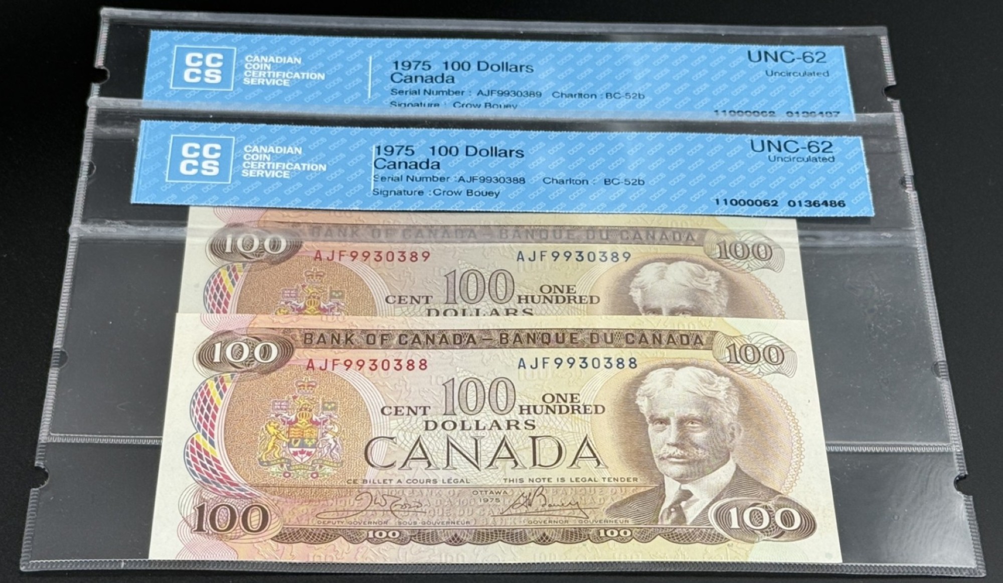 Banque du Canada – 100 Dollars 1975 – 2 Consécutifs – Crow/Bouey – Préfixe AJF – UNC62 – BC-52b