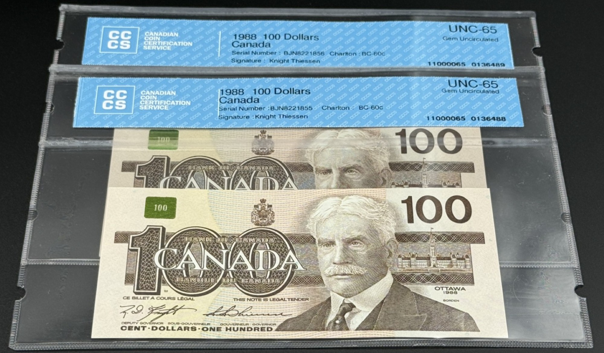 Banque du Canada – 100 Dollars 1988 – 2 Consécutifs – Knight/Thiessen – Préfixe BJN – GEM65 – BC-60c