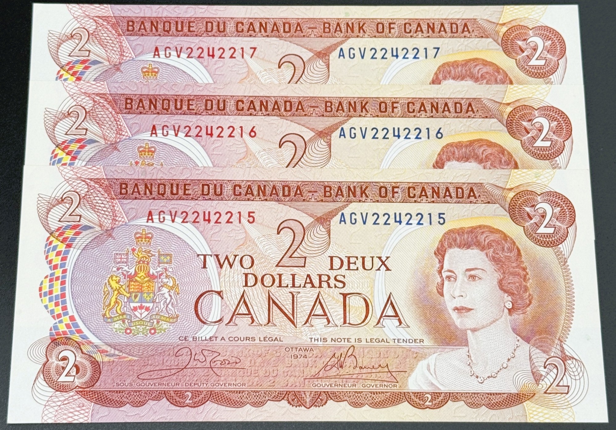 Banque du Canada – 2 Dollars 1974 – 3 Consécutifs – Crow/Bouey – Préfixe AGV – UNC