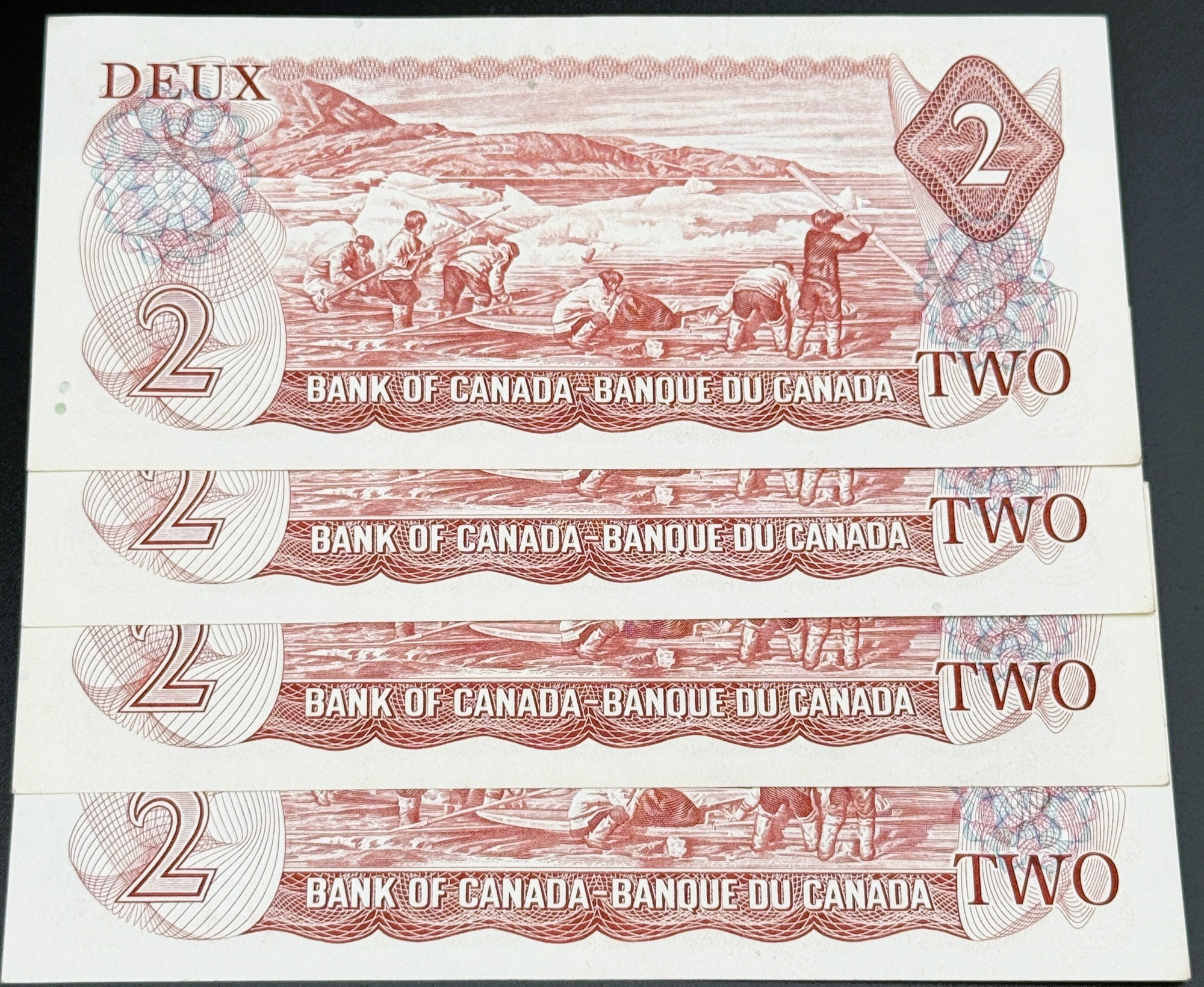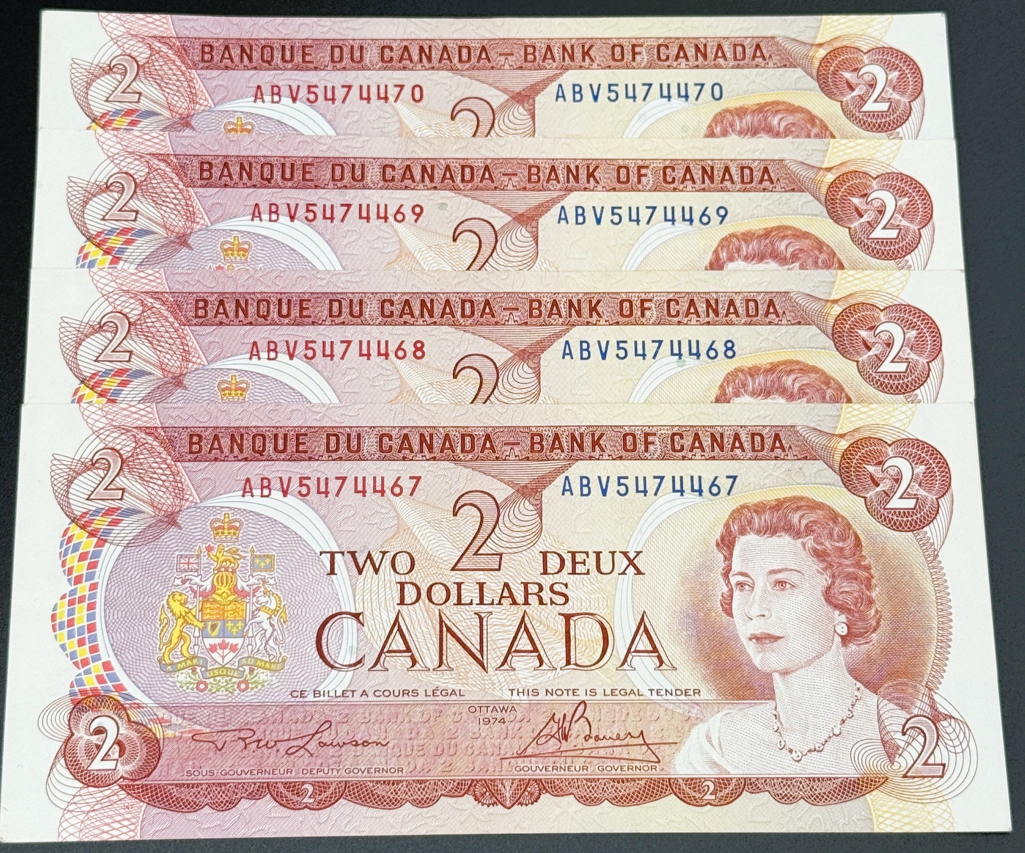 Banque du Canada – 2 Dollars 1974 – 4 Consécutifs – Lawson/Bouey – Préfixe ABV – UNC