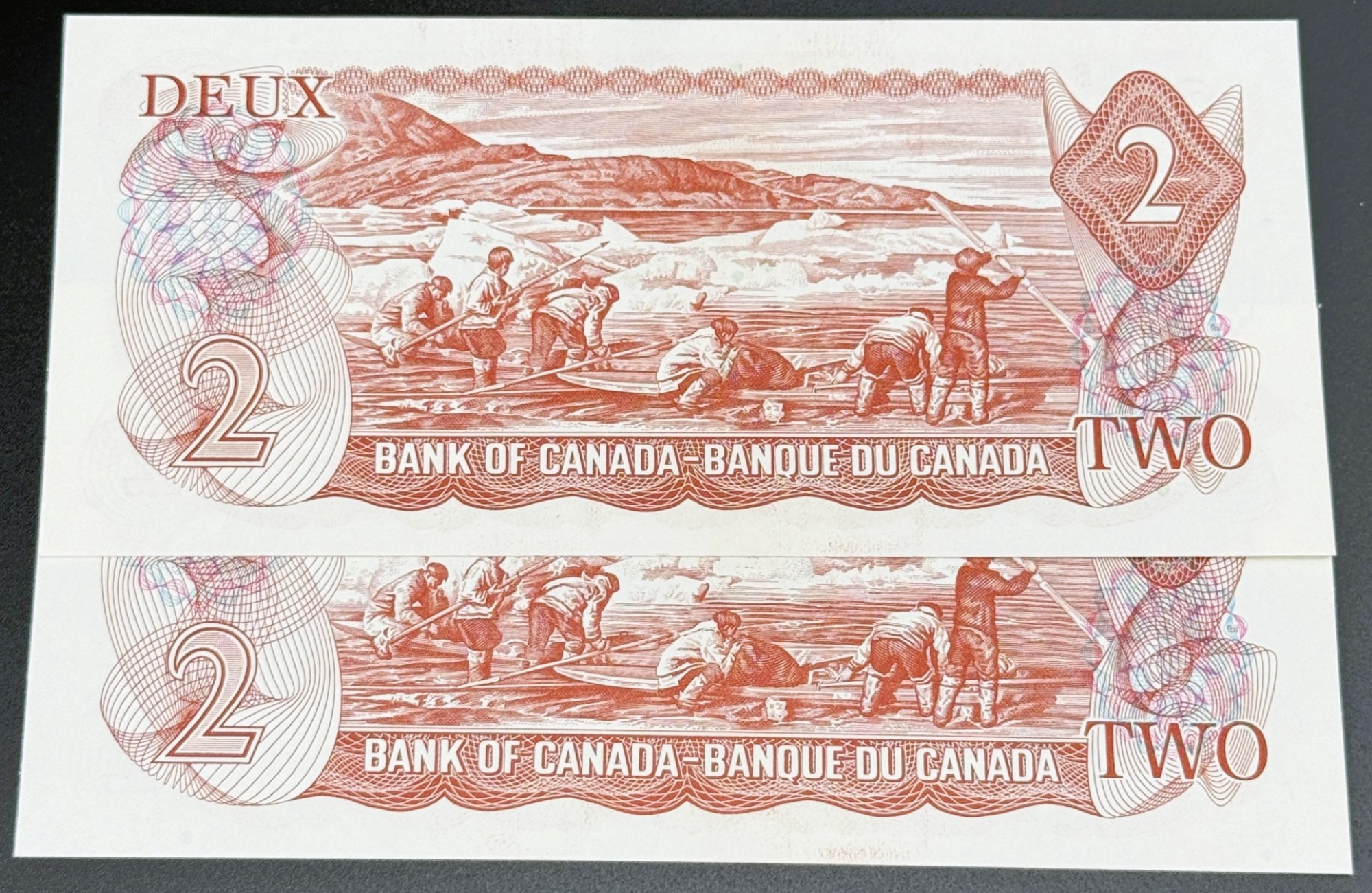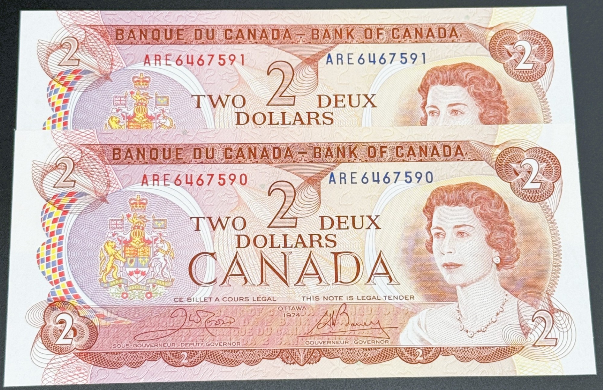 Banque du Canada – 2 Dollars 1974 – 2 Consécutifs – Crow/Bouey – Préfixe ARE – UNC