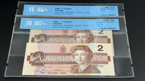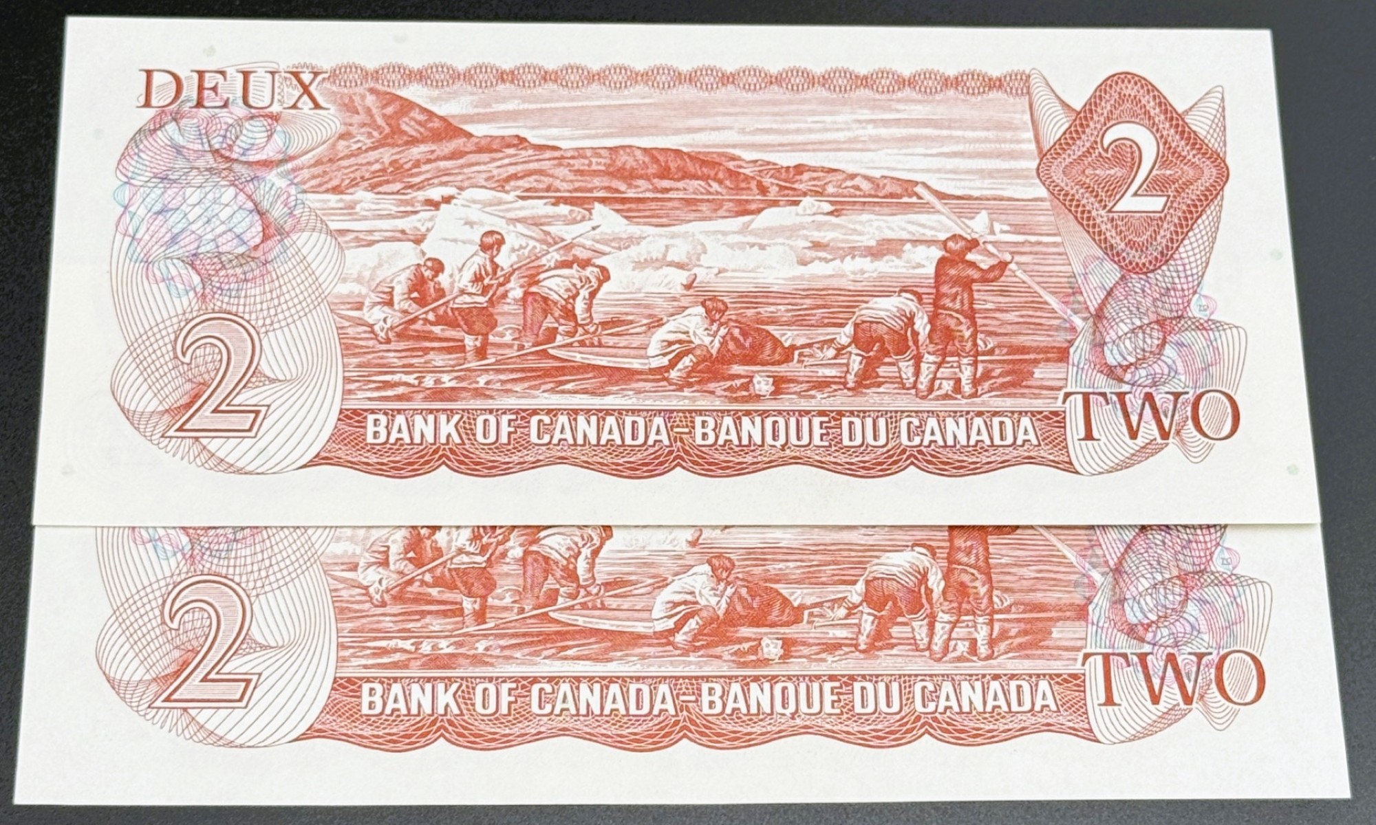 Émis dans le cadre de la série multicolore de 1974, ce billet de 2 Dollars présente au recto le portrait de la reine Elizabeth II, symbole de continuité monarchique, et au verso une gravure représentant une scène de chasse inuit sur l’île de Baffin, inspirée d’une photographie de Doug Wilkinson et gravée par C. Gordon Yorke, mettant en valeur les traditions nordiques et l’identité culturelle du Canada. Portant les signatures de Crow et Bouey et le préfixe ARB, ces deux exemplaires se distinguent par leur cohérence historique et leur état Uncirculated (UNC), avec papier intact, couleurs éclatantes et détails parfaitement nets. Leur attrait est renforcé par le fait qu’ils forment une séquence de 2 billets consécutifs, ajoutant une continuité appréciée par les collectionneurs. Véritable ensemble patrimonial, ce duo conjugue prestige, authenticité et rareté, séduisant autant par la qualité de conservation que par la singularité de leurs numéros alignés.
