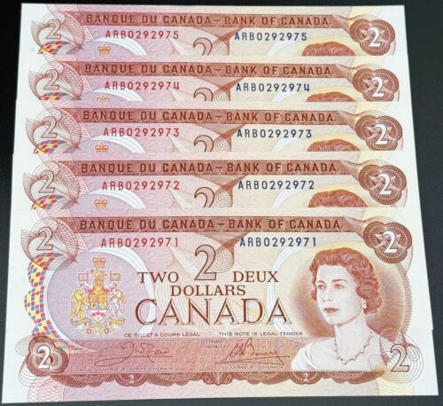 Banque du Canada – 2 Dollars 1974 – 2 Consécutifs – Crow/Bouey – Préfixe ARB – UNC