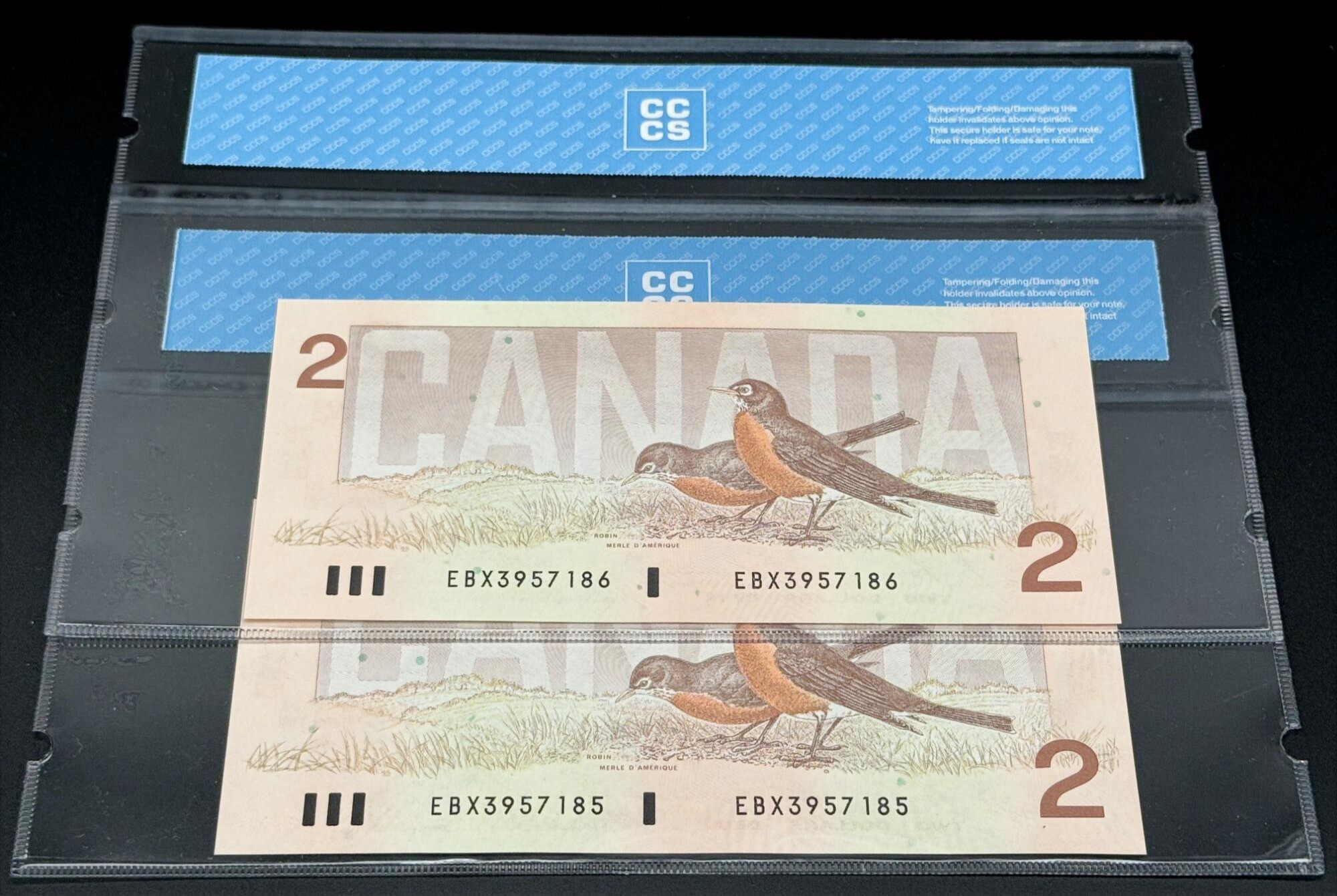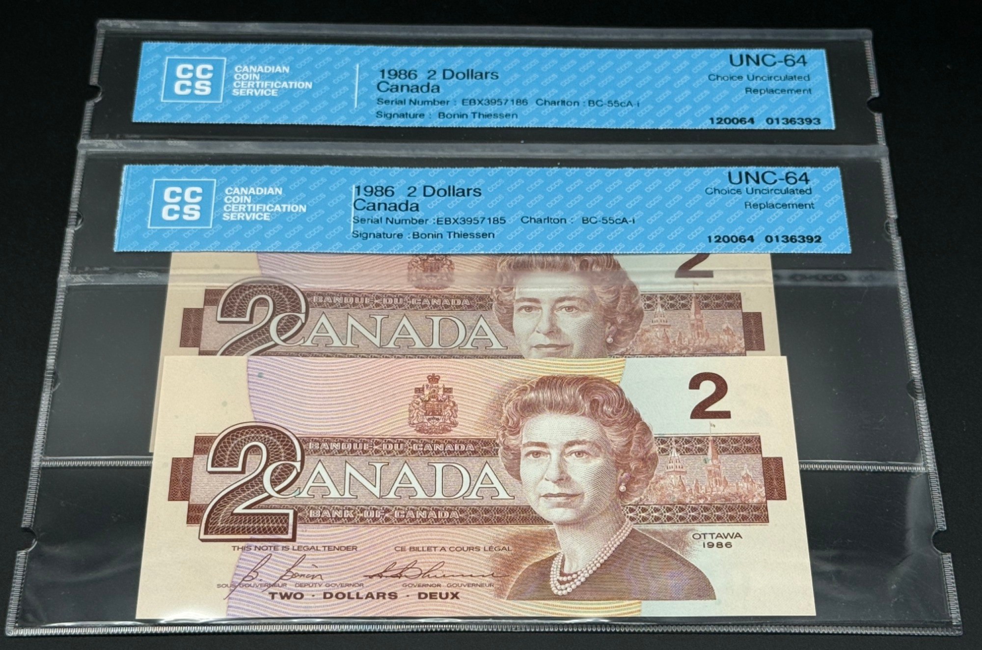 Banque du Canada – 2 Dollars 1986 – Remplacement – 2 Consécutifs – Bonin/Thiessen – Préfixe EBX – Certifié UNC64 – BC-55cA-i