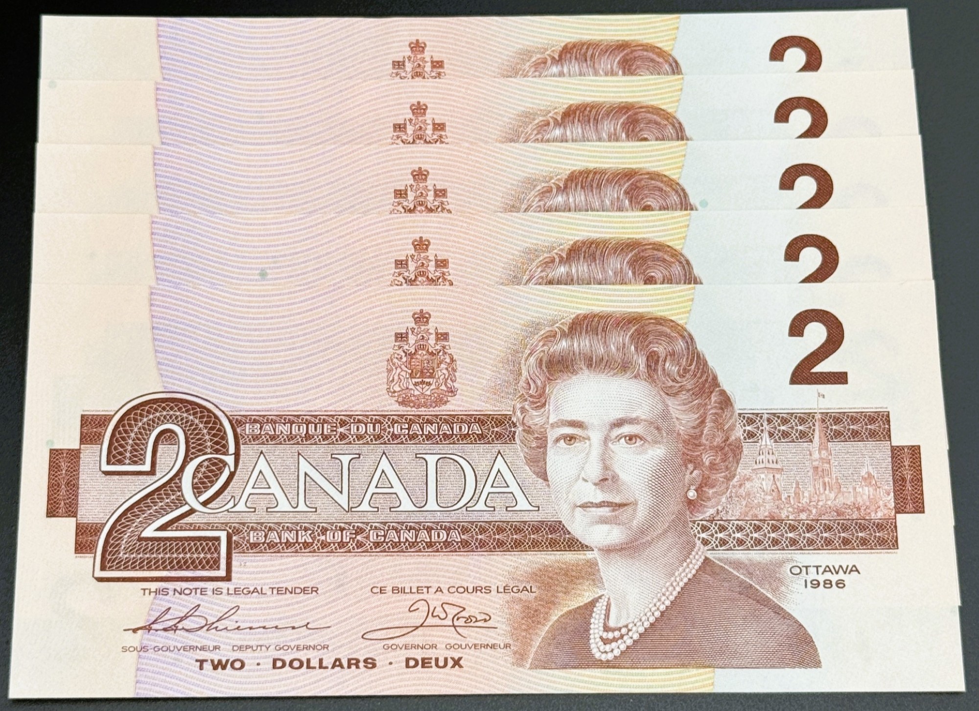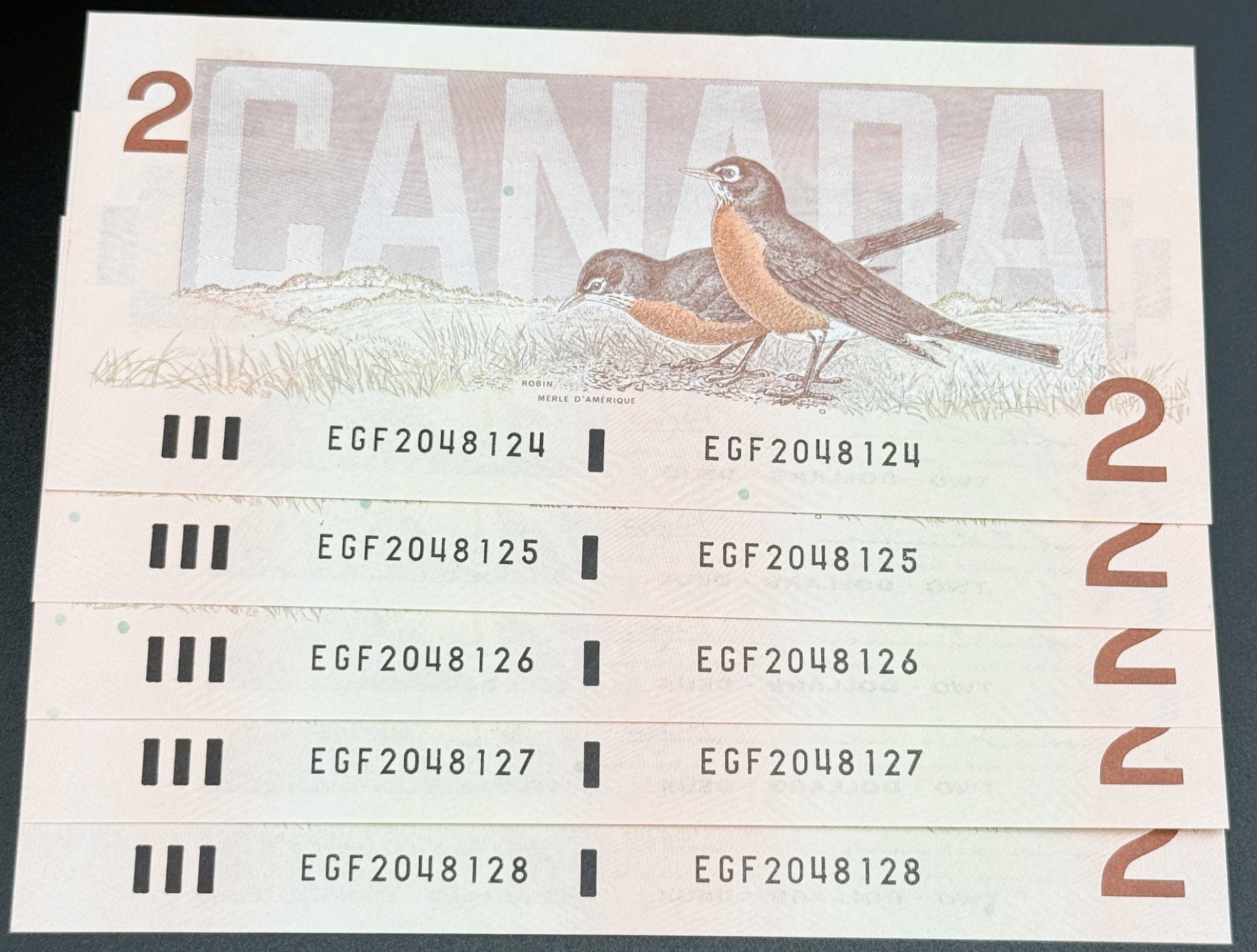 Banque du Canada – 2 Dollars 1986 – 5 Consécutifs – Thiessen/Crow – Préfixe – EGF – UNC