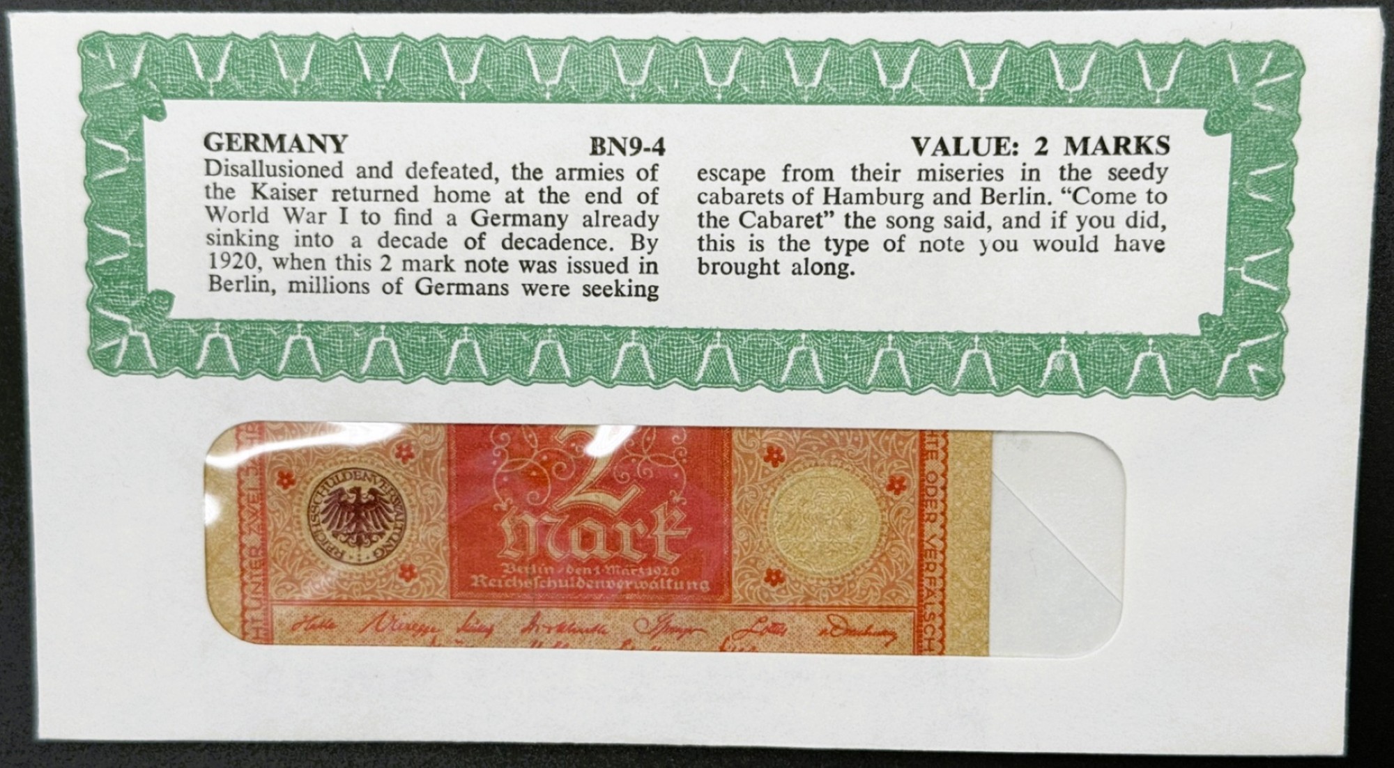 Émis à Berlin le 1er mars 1920 par la Reichsschuldenverwaltung, ce billet de 2 Marks est un Darlehnskassenschein, ou bon de prêt d’État, utilisé pour soutenir l’économie allemande dans l’après‑guerre. Son design mêle ornementation classique, emblème impérial (l’aigle du Reich), et typographie gothique, dans une composition visuellement riche. Dans un état VF (Very Fine), le papier conserve sa structure, les détails restent nets, et les couleurs bien présentes. Ce billet est recherché pour sa valeur historique, sa présentation intacte, et son rôle dans une période de reconstruction économique. Il constitue une pièce de collection emblématique, à la croisée de l’art fiduciaire et du contexte géopolitique de l’Allemagne de l’entre‑deux‑guerres.