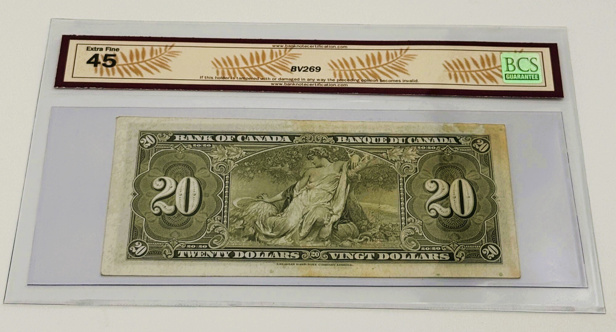Émis dans la première série complète de la Banque du Canada, ce billet de 20 Dollars 1937 incarne la jeunesse institutionnelle de la banque centrale, fondée et opérationnelle dès 1935. Le recto présente le portrait du roi George VI, symbole de continuité monarchique et de stabilité à la veille de la Seconde Guerre mondiale, encadré par un décor ornemental riche et solennel. Le verso illustre une allégorie de l’Agriculture, avec une figure féminine tenant une gerbe de blé, accompagnée d’outils et de symboles agricoles, célébrant la fertilité des terres canadiennes et l’importance de l’économie rurale. Portant les signatures de Coyne et Towers et le préfixe KE, cet exemplaire certifié EF45 présente une qualité appréciable : usure modérée mais détails nets et couleurs encore bien présentes, offrant toute la force de son design original. Ce billet conjugue authenticité, prestige patrimonial et rareté, séduisant autant par son état préservé que par la force narrative de son iconographie institutionnelle.