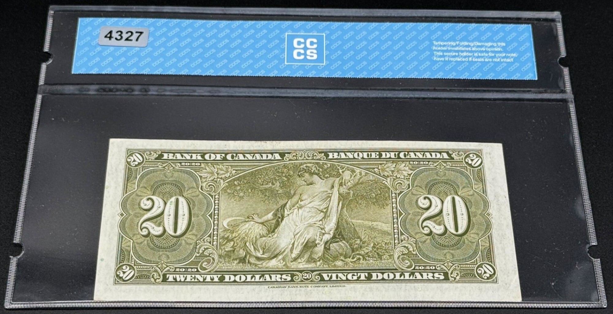 Émis dans la série de 1937, ce billet de 20 dollars, portant les signatures de Coyne et Towers, le préfixe HE et gradé AU50, illustre une préservation solide pour cette émission emblématique. Le recto présente l’effigie de Sa Majesté le roi George VI, tandis qu’au verso figure une allégorie de la fertilité : une femme assise tenant une faucille, devant un paysage composé d’un lac, de montagnes et d’arbres fruitiers, une scène symbolique rendue avec la finesse classique propre à cette série. Le grade AU50 témoigne d’un billet demeuré net et bien conservé, où subsistent la force du papier, la précision des détails imprimés et une présence générale supérieure à la moyenne pour cette génération.