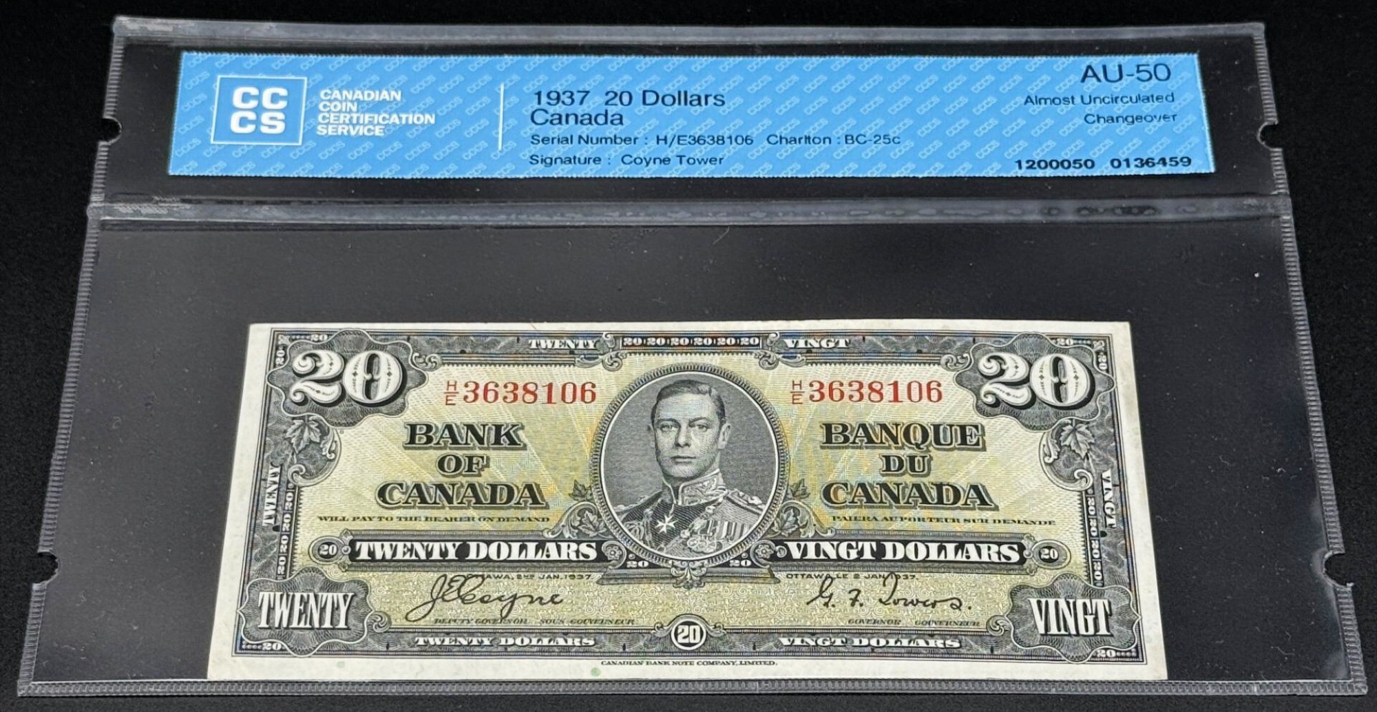 Banque du Canada – 20 Dollars 1937 – Coyne/Towers – Préfixe HE – Certifié AU50 – BC-25c