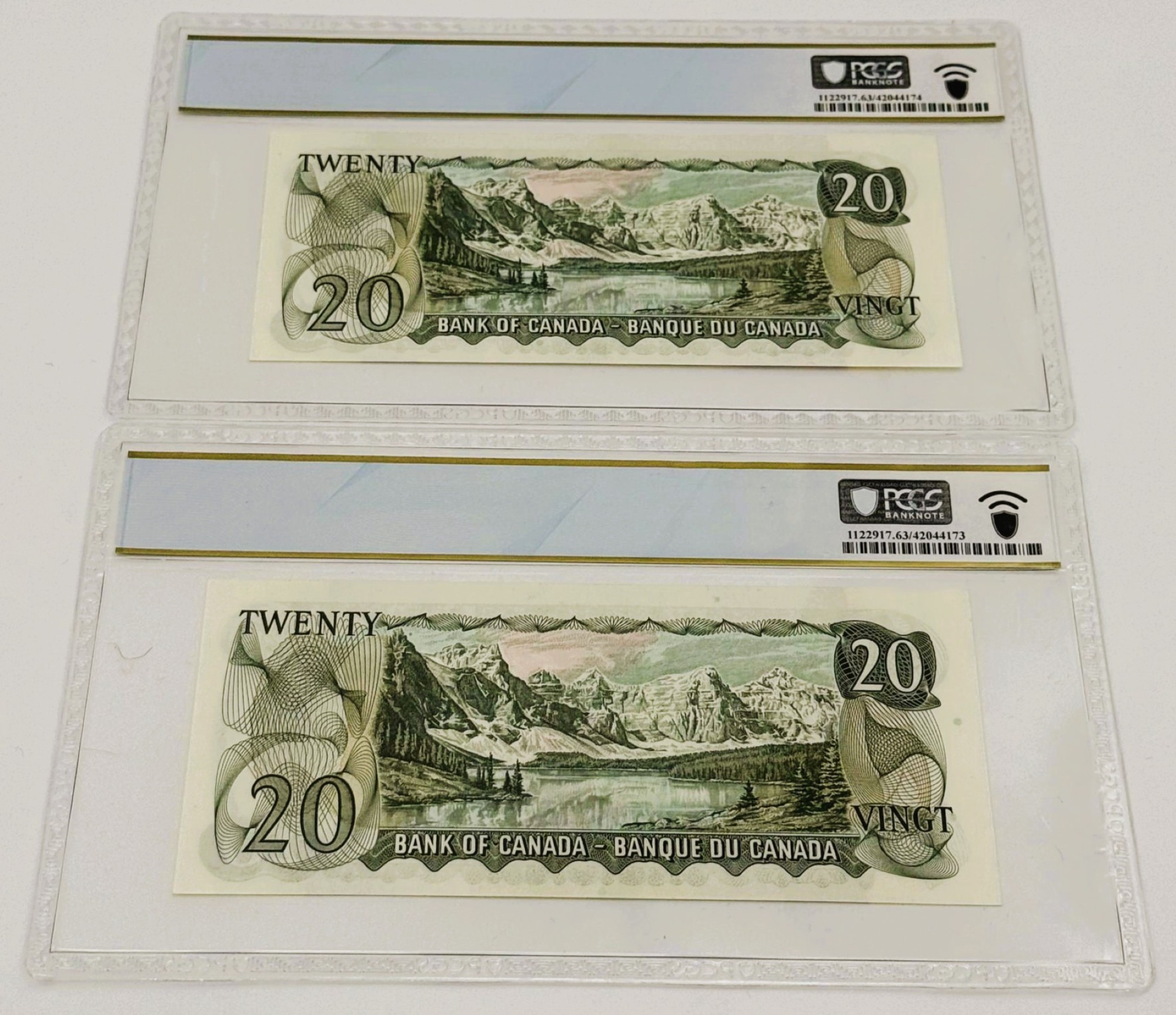 Émis dans le cadre de la série Scènes du Canada, ces deux billets consécutifs de 20 dollars portent les signatures de Beattie (Sous-gouverneur) et Raminski (Gouverneur), ainsi que le préfixe EK, attribué aux émissions régulières de cette période. Le recto présente le portrait de la reine Elizabeth II, gravé par George Gundersen d’après une photographie de Yousuf Karsh, symbole de continuité monarchique et de stabilité institutionnelle. Certifiés Uncirculated 63, ces billets se distinguent par leur fraîcheur, leur alignement sériel et leur attrait visuel. Le verso illustre le lac Moraine, situé dans la vallée des Dix Pics en Alberta — une scène majestueuse choisie pour représenter la beauté naturelle du Canada et renforcer le lien entre identité nationale et patrimoine géographique. Témoins d’une époque de modernisation monétaire et d’affirmation culturelle, ces billets incarnent l’union entre rigueur fiduciaire et célébration du territoire.