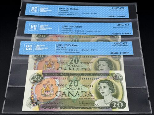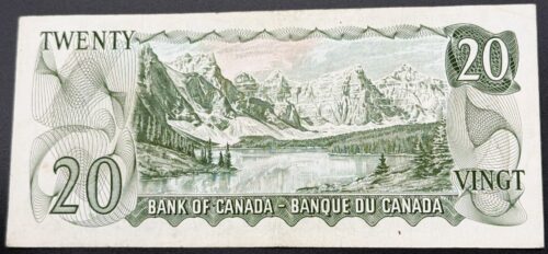 Cet exemplaire du billet de 20 dollars canadiens de 1969, portant les signatures de Lawson et Bouey, le préfixe YA et classé UNC, appartient à la première émission de la série multicolore. Le recto présente l’effigie de la Reine Élisabeth II dans une composition modernisée aux teintes vertes, tandis qu’au verso figure une vue du Moraine Lake, dans le parc national Banff, gravure emblématique de cette série. Grâce à son grade UNC, l’exemplaire offre une fraîcheur intacte et illustre pleinement l’esthétique nette et contemporaine de cette émission.