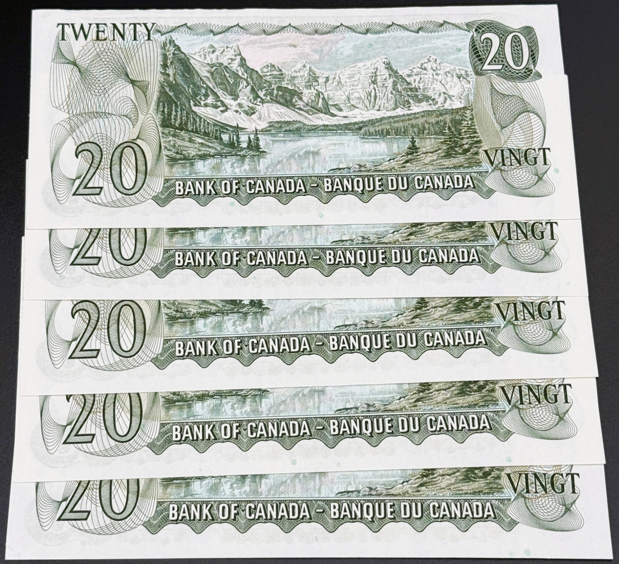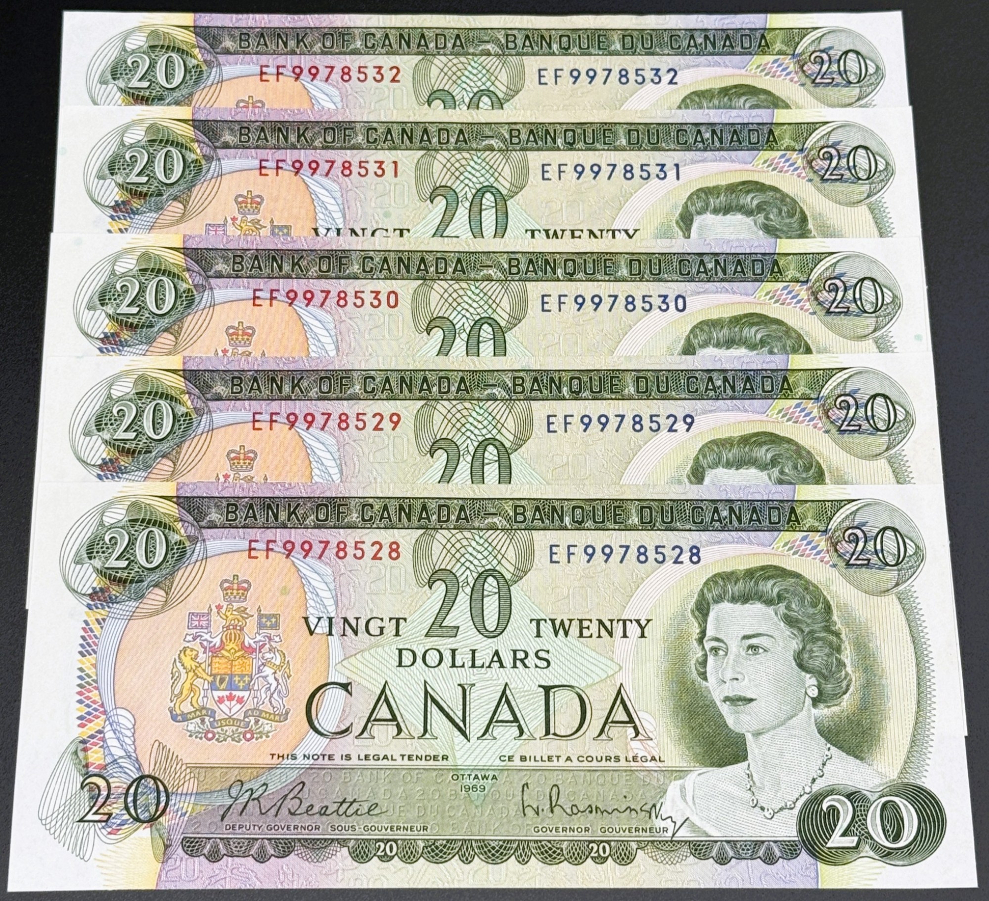 Banque du Canada – 20 Dollars 1969 – 5 Consécutifs – Beattie/Rasminski – Préfixe E/F – UNC