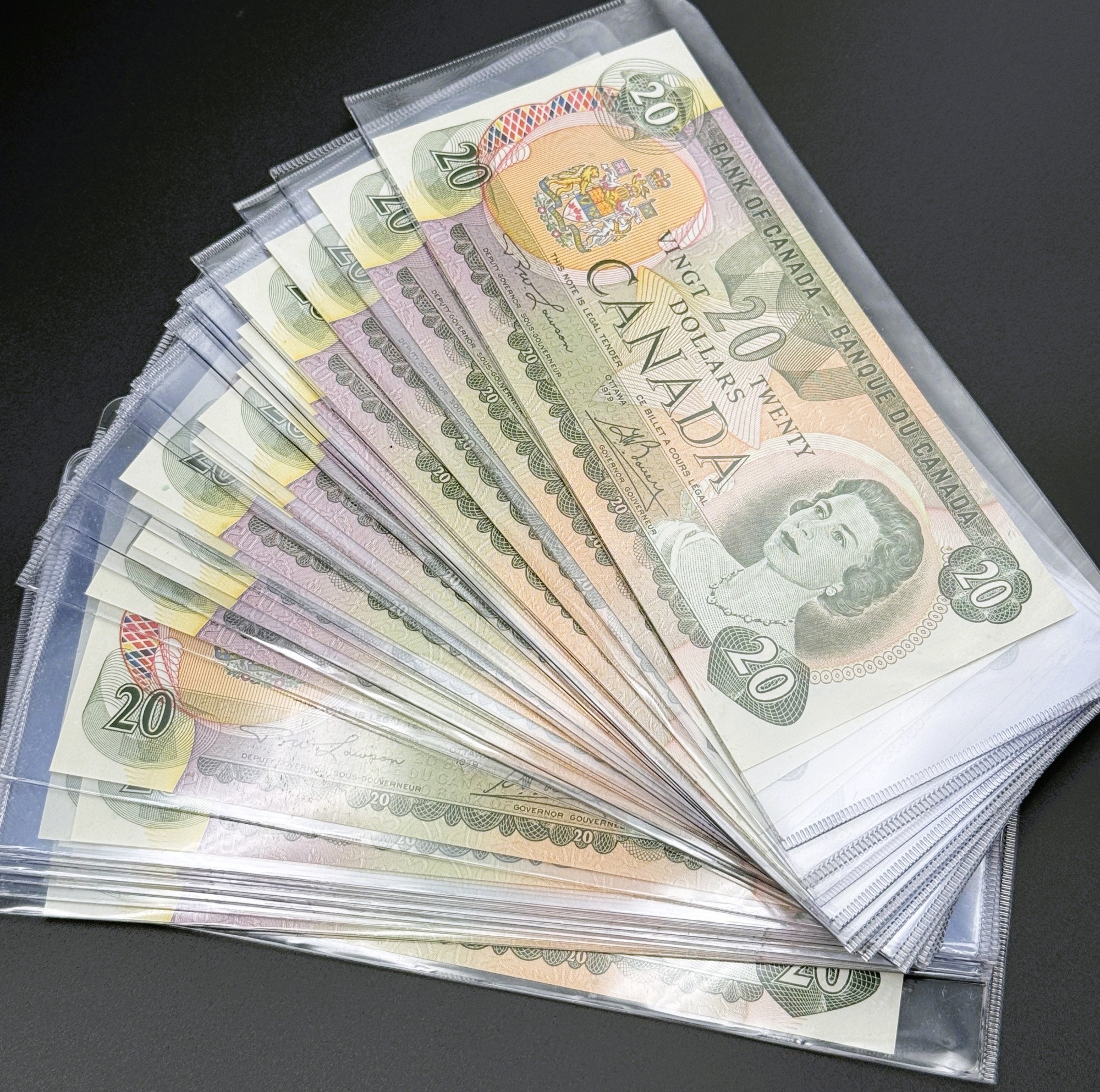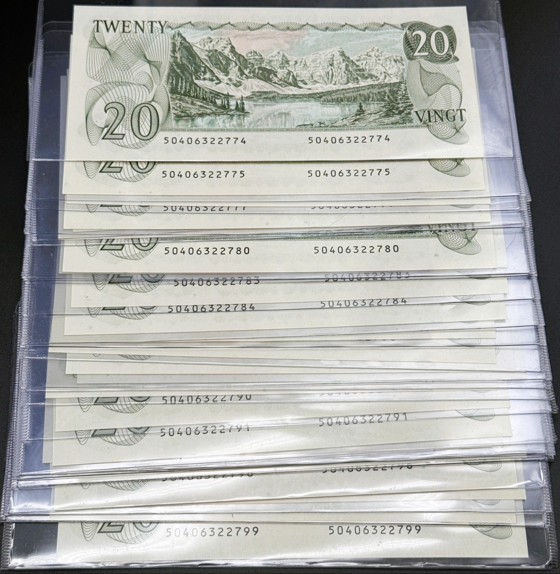 Cet ensemble remarquable de vingt‑six exemplaires consécutifs du billet de 20 dollars canadien, signés par Lawson et Bouey et préservés en état UNC, illustre l’une des présentations les plus abouties de la série Scènes du Canada. Le recto met en valeur l’effigie raffinée de la Reine Élisabeth II, gravée par Gundersen, accompagnée des Armoiries du Canada dans une palette chromatique rééquilibrée qui modernise subtilement cette émission de la fin des années 1970. Au verso, la gravure du lac Moraine et de la vallée des Dix‑Pics, rendue avec une approche plus naturelle et plus harmonieuse que dans l’édition précédente, confère au billet une dimension patrimoniale forte et une présence visuelle marquante. La rareté d’une séquence complète de vingt‑six numéros alignés renforce le prestige de cet ensemble long, recherché pour son homogénéité, son impact visuel et sa valeur dans une collection structurée.