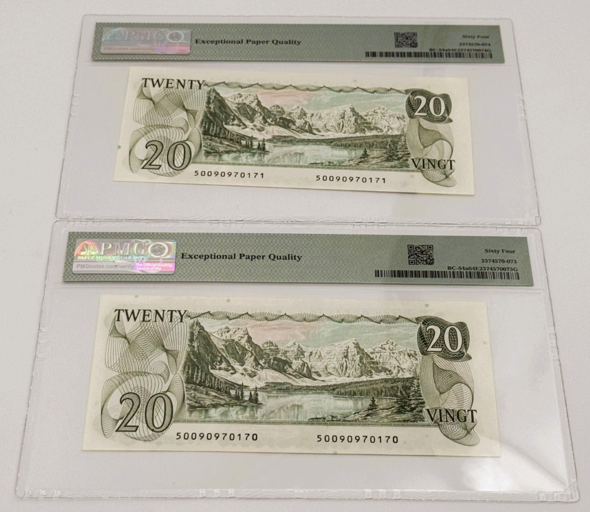 Émis dans le cadre de la série Scènes du Canada, ces deux billets consécutifs de 20 dollars portent les signatures de Lawson (Sous-gouverneur) et Bouey (Gouverneur), ainsi que le préfixe attribué aux émissions régulières de cette période. Le recto présente le portrait de la reine Elizabeth II, gravé par George Gundersen d’après une photographie de Yousuf Karsh, symbole de continuité monarchique et de stabilité institutionnelle. Certifiés Uncirculated 64, ces billets conservent une fraîcheur remarquable et une cohérence sérielle prisée. Le verso illustre le lac Moraine, situé dans la vallée des Dix Pics en Alberta — une scène emblématique du patrimoine naturel canadien, choisie pour sa majesté et sa résonance nationale. Témoins d’une époque de raffinement graphique et de modernisation fiduciaire, ces billets incarnent l’union entre rigueur institutionnelle et célébration du territoire.