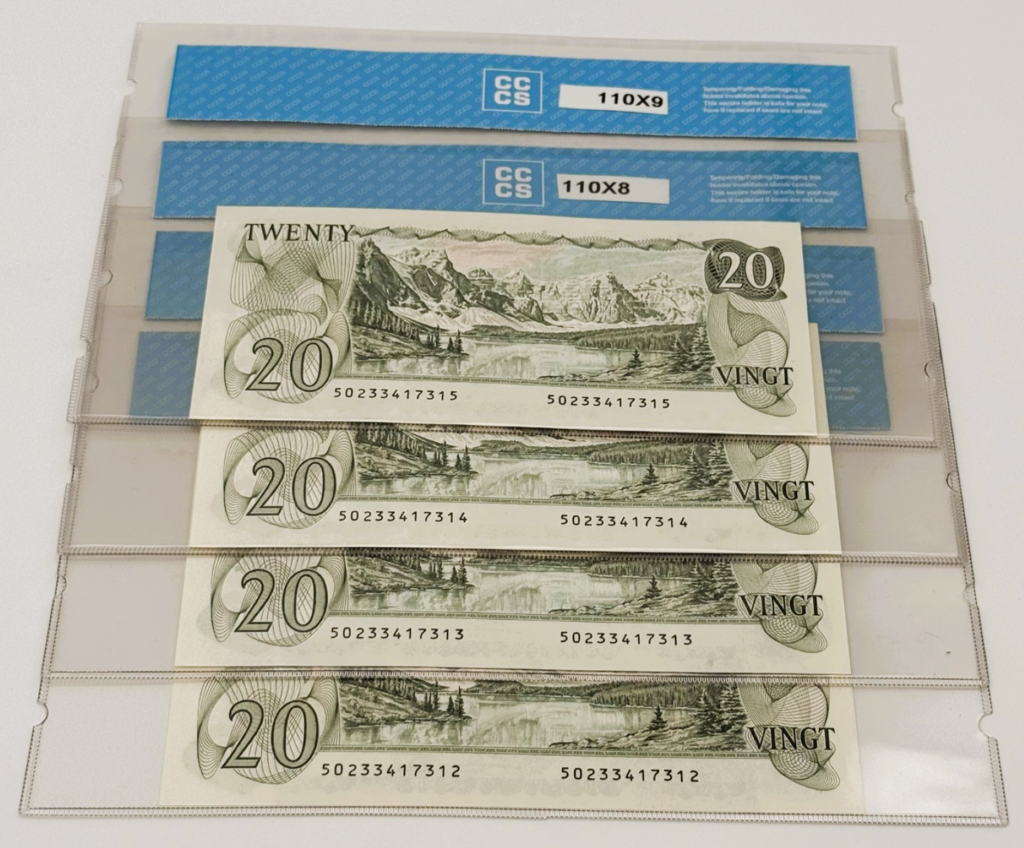 Émis dans le cadre de la série Scènes du Canada, ces quatre billets consécutifs de 20 dollars portent les signatures de Lawson (Sous-gouverneur) et Bouey (Gouverneur), ainsi que le préfixe attribué aux émissions régulières de cette période. Le recto présente le portrait de la reine Elizabeth II, gravé par George Gundersen d’après une photographie de Yousuf Karsh, symbole de continuité monarchique et de stabilité institutionnelle. Certifiés Uncirculated 64, ces billets conservent une fraîcheur remarquable et une cohérence sérielle prisée. Le verso illustre le lac Moraine, situé dans la vallée des Dix Pics en Alberta — une scène emblématique du patrimoine naturel canadien, choisie pour sa majesté et sa résonance nationale. Témoins d’une époque de raffinement graphique et de modernisation fiduciaire, ces billets incarnent l’union entre rigueur institutionnelle et célébration du territoire.